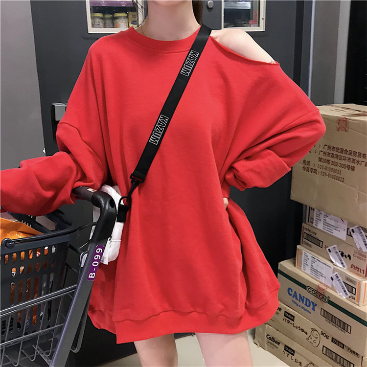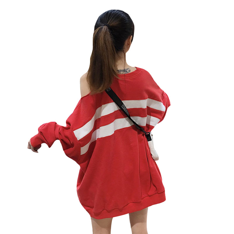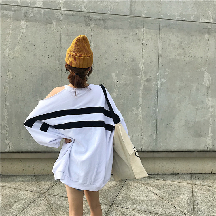 / 秋季女裝韓版中長款拼接條紋露肩寬松套頭衛衣長袖休閑上衣外套潮