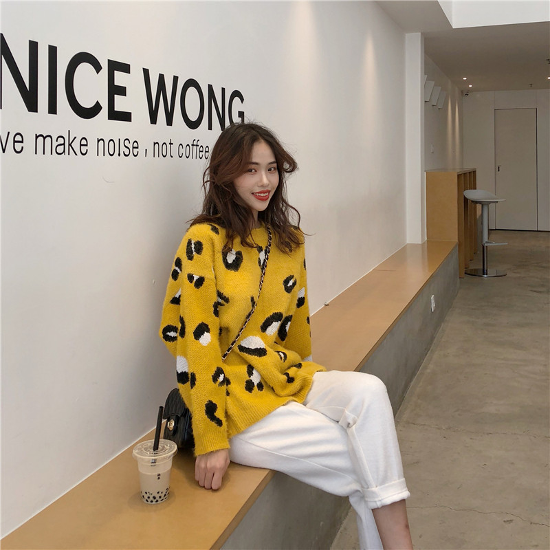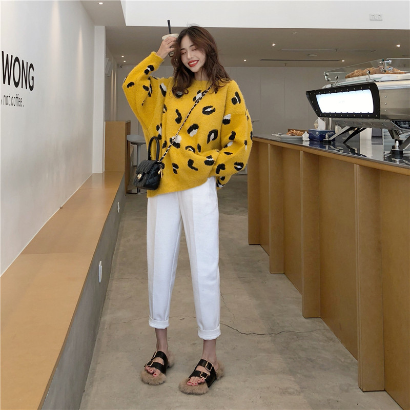 / 圓領豹寬松慵懶風紋毛毛斑點針織衫高腰直筒蘿卜毛呢褲時尚套裝女