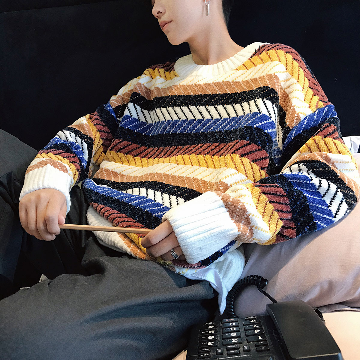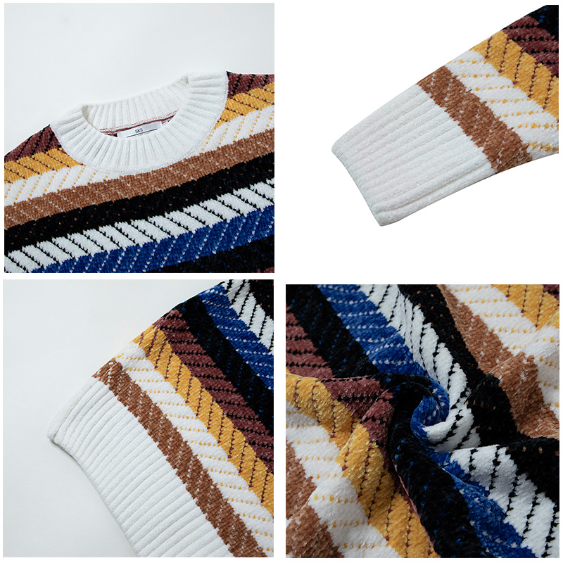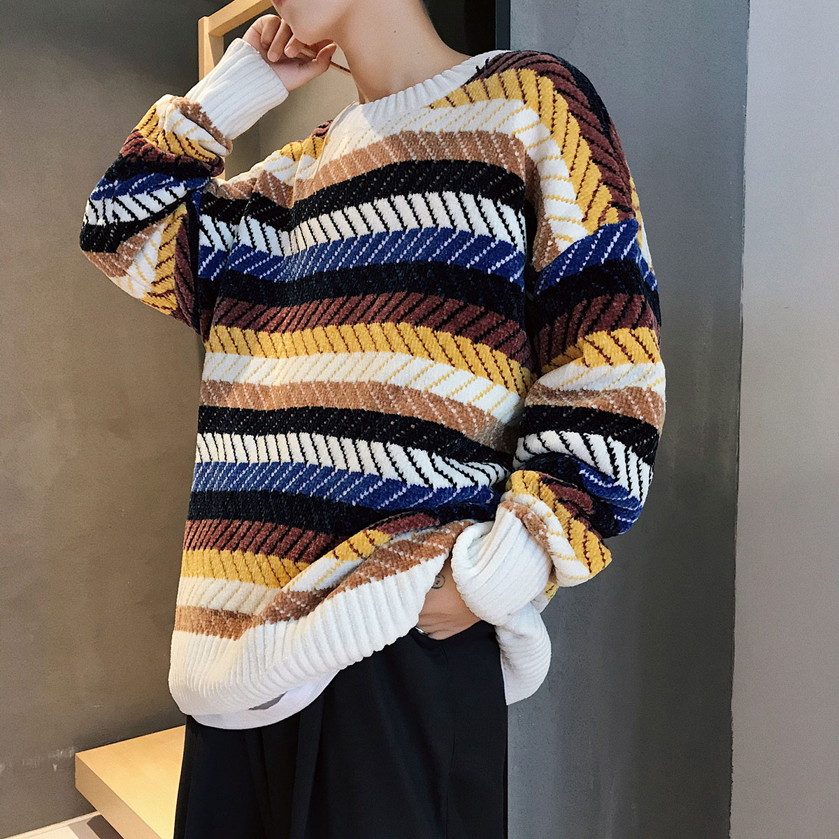 新款條紋男士毛衣秋季寬松休閑長袖針織衫韓版潮港風男裝潮流衣服