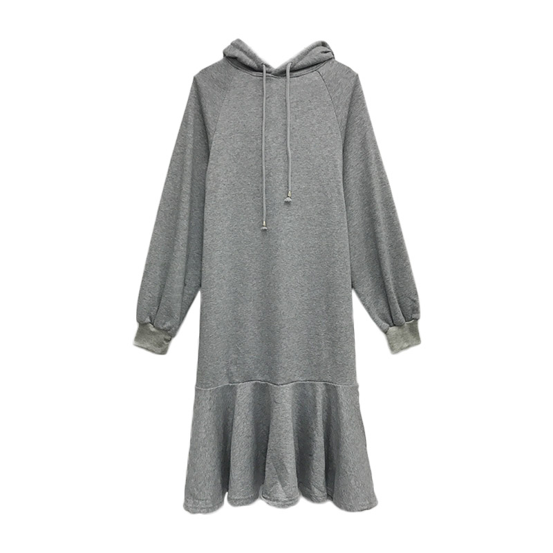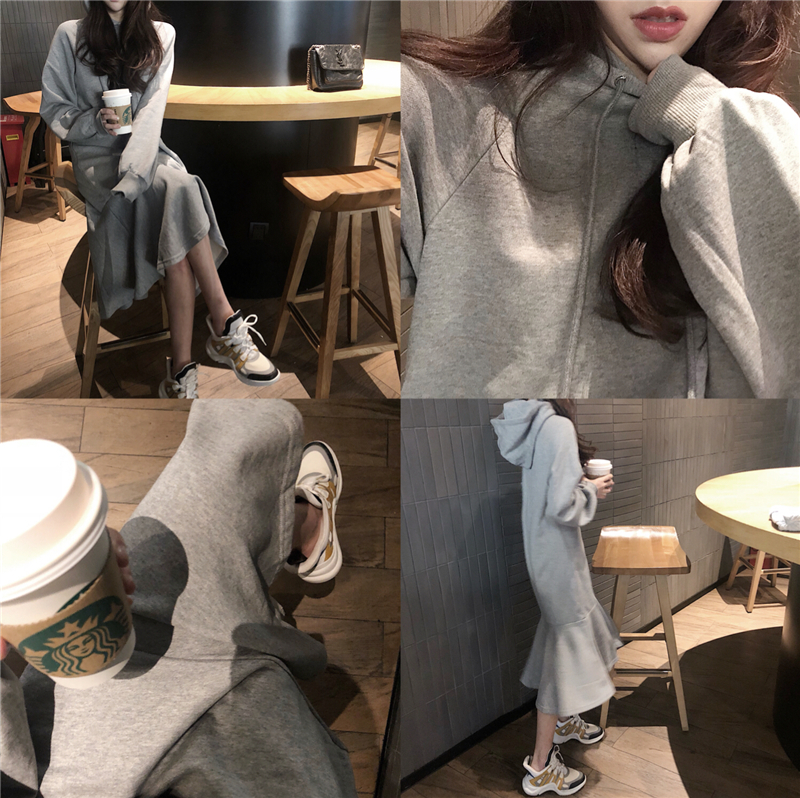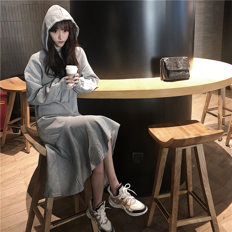 chic早秋裙子長裙女慵懶風韓版百搭寬松連帽系帶過膝長袖連衣裙潮