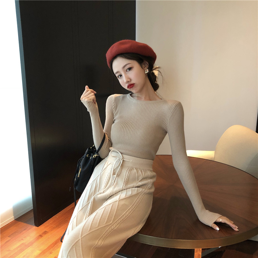 / 復古港味秋裝女2018新款百搭純色針織衫坑條修身長袖圓領打底上衣