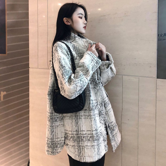 復古外套女春秋2018新款韓版百搭款寬松粗花呢中長款小香風外套潮