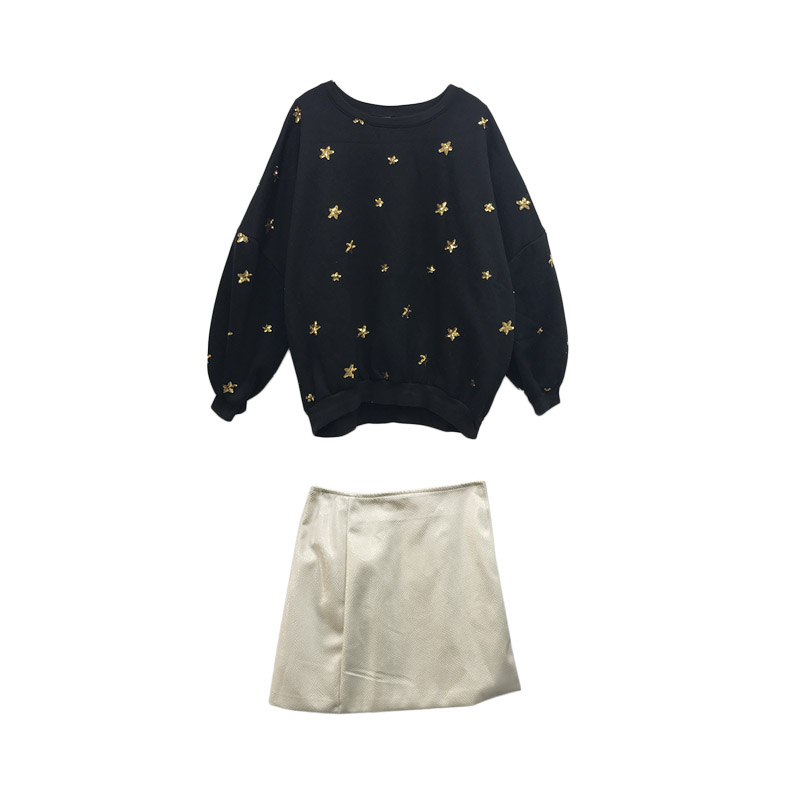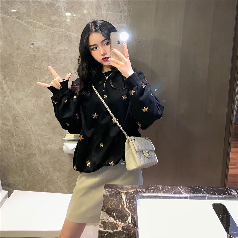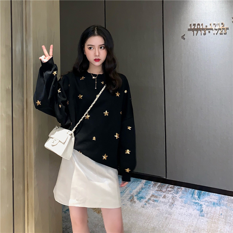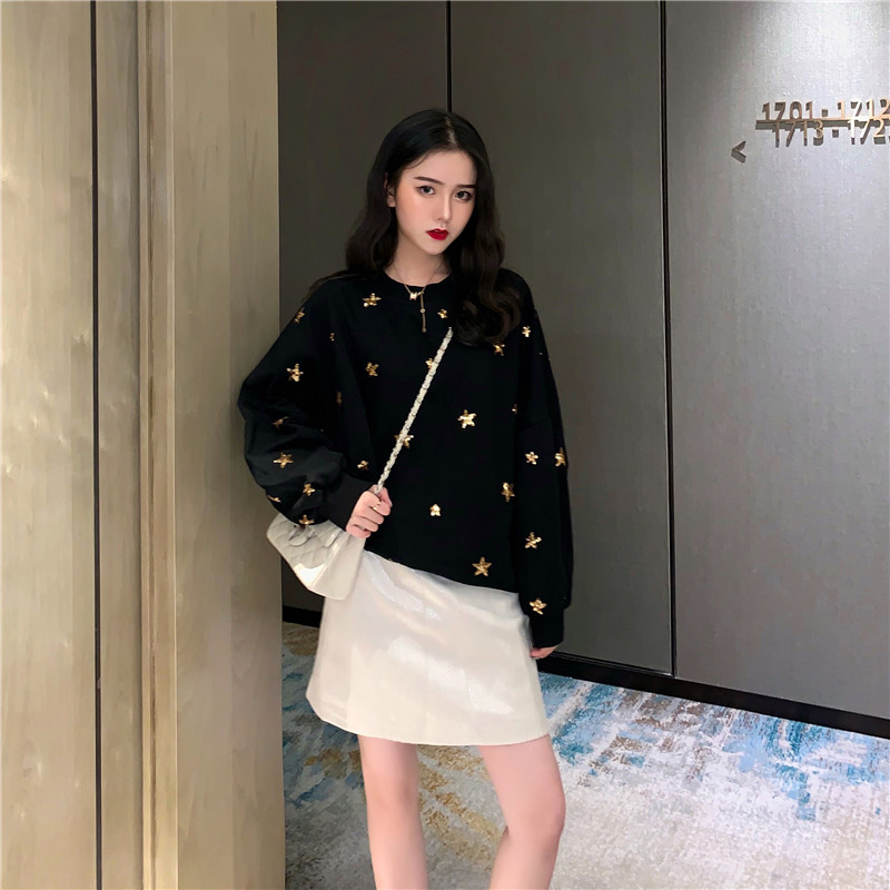 / 韓版女神套裝秋冬新款寬松短款星星刺繡衛衣+高腰包臀皮裙兩件套