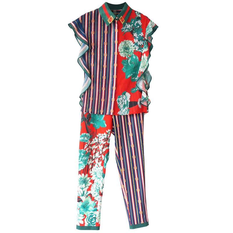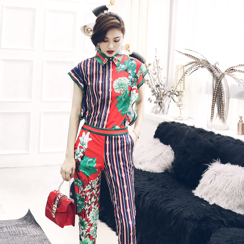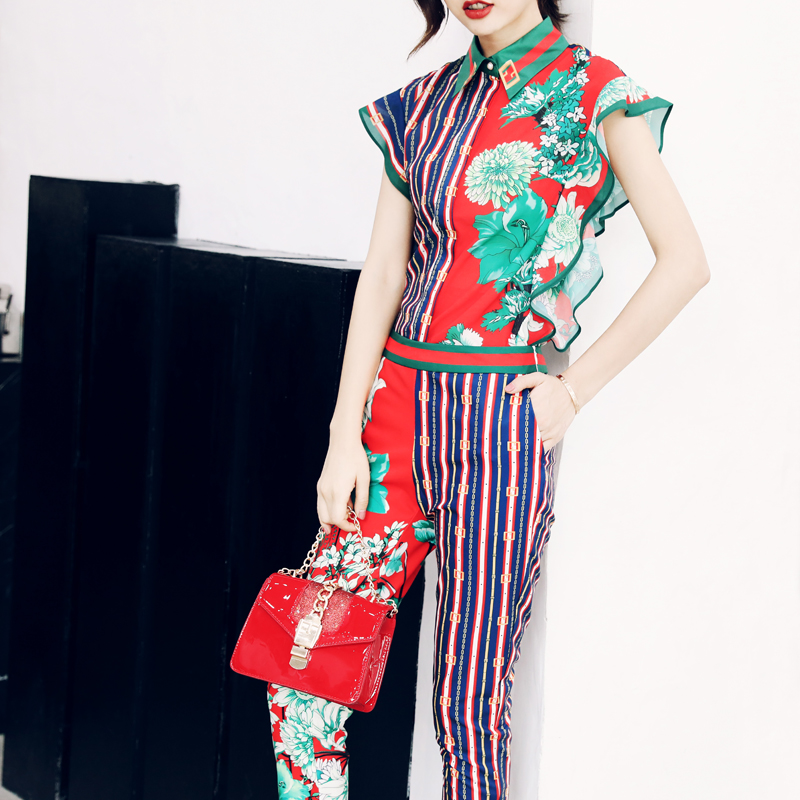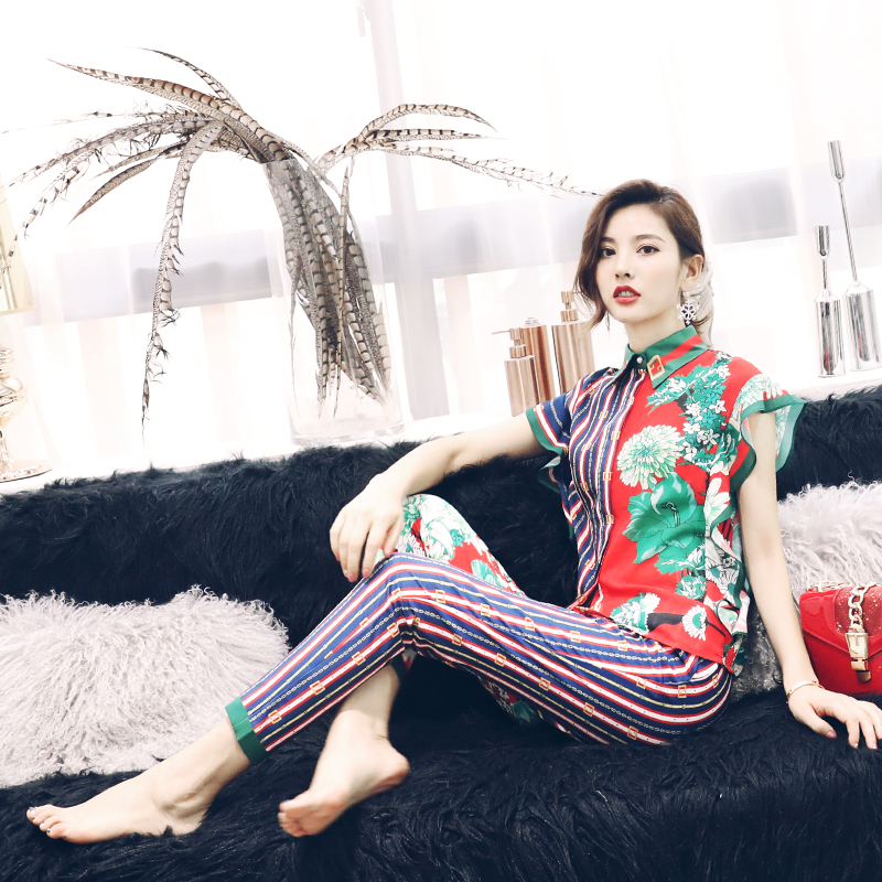 / 歐美小腳褲套裝女夏2018新款時尚氣質印花襯衫上衣七分褲兩件套潮