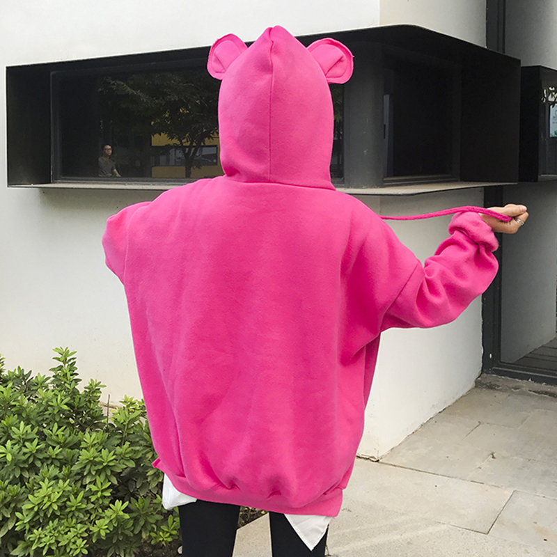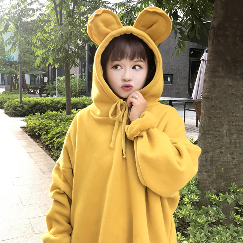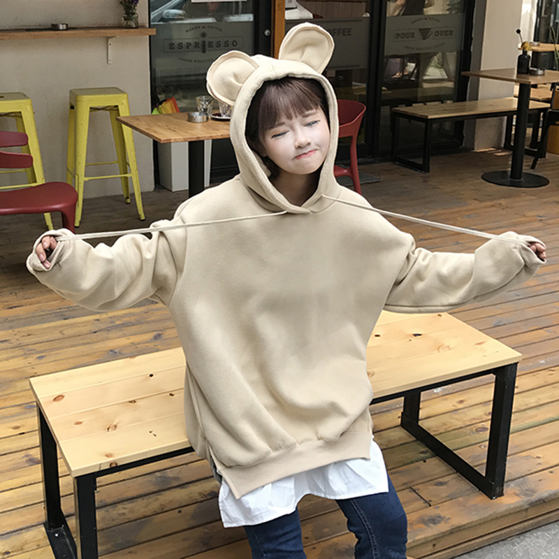 / 可愛熊耳朵加絨連帽衛衣秋冬女裝新款開叉假兩件外套寬松長袖上衣