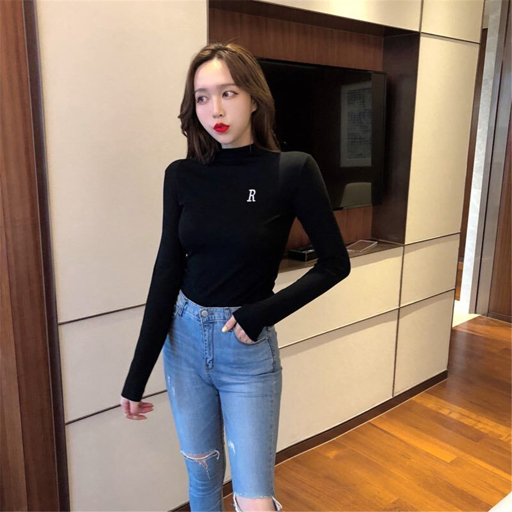 / chic早秋上衣女2018新款韓版T恤修身顯瘦百搭半高領刺繡打底衫潮