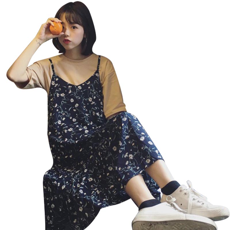 / 夏季女裝韓版甜美小清新吊帶裙中長款碎花雪紡連衣裙寬松過膝裙子