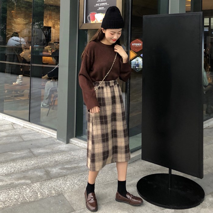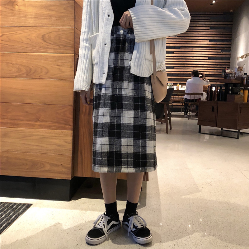 可可里小姐~超火毛呢格子高腰中長款半身裙