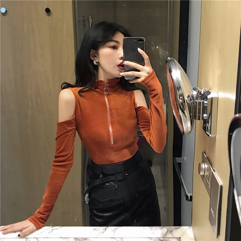 / 港味秋冬新款韓版時尚chic修身性感上衣領口拉鏈小高領露肩打底衫