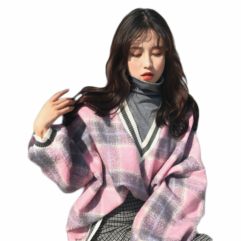 / 早秋衛衣2018新款女長袖韓版寬松百搭假兩件V領格子呢料套頭上衣