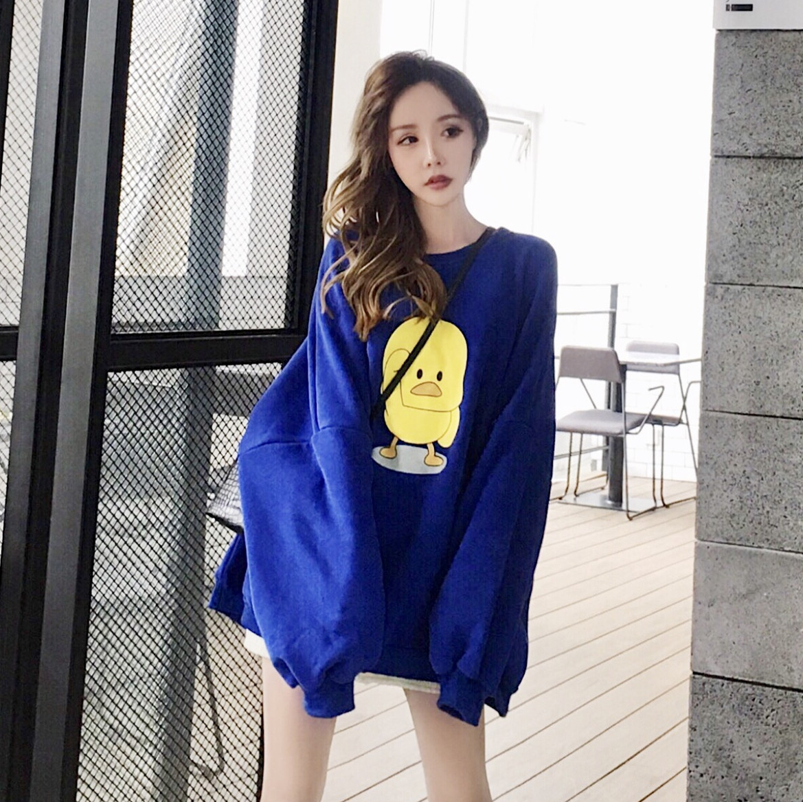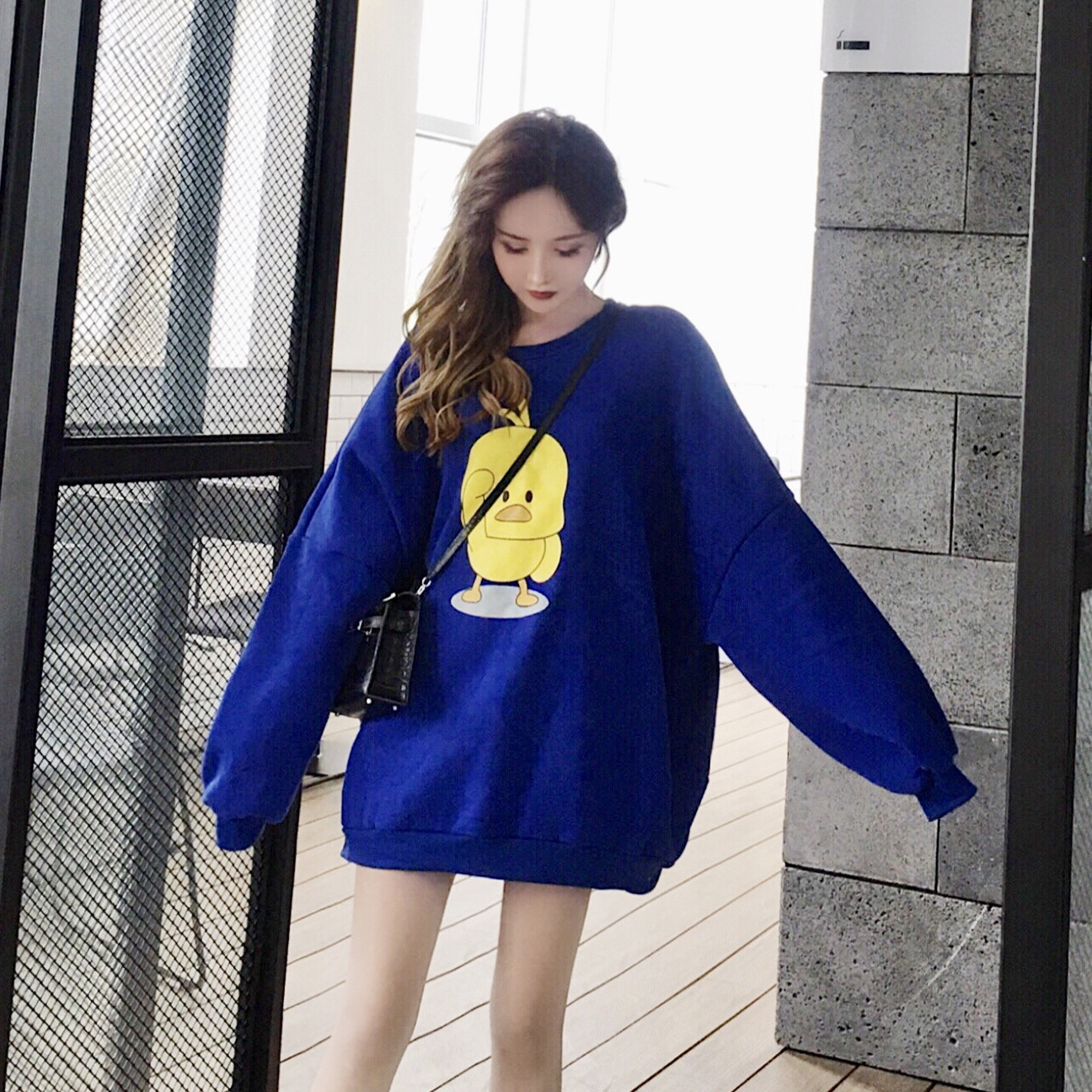 chic秋冬上衣慵懶衛衣女秋圓領加絨加厚中長款寬松套頭網紅小黃鴨