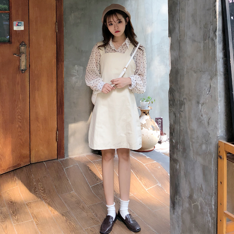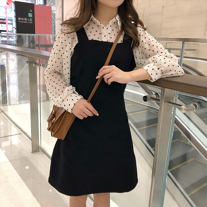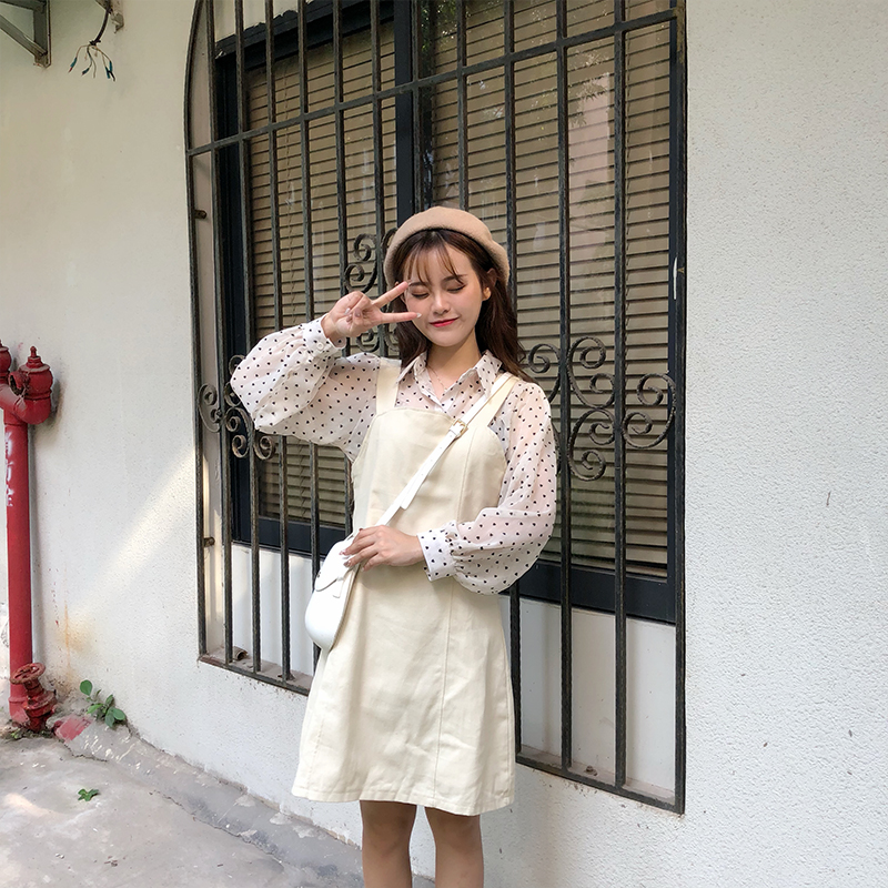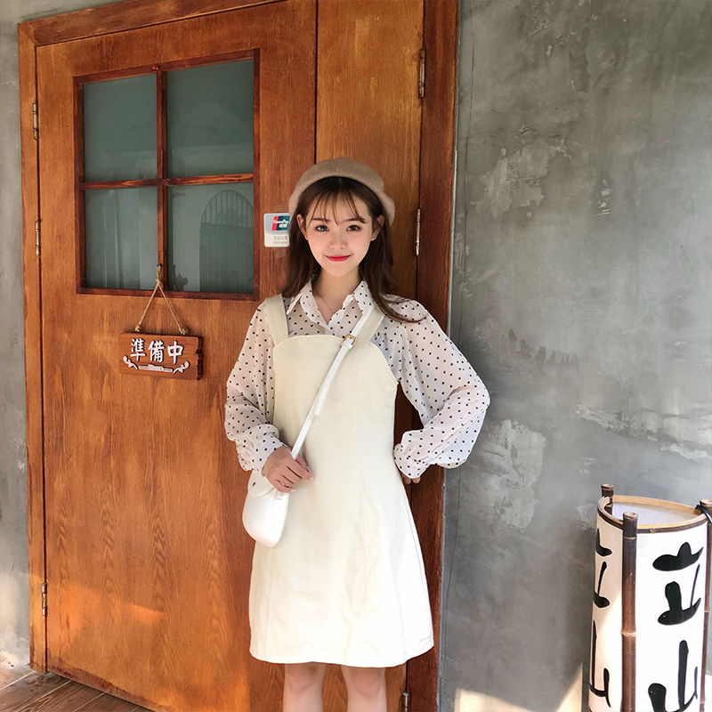 / 韓版時尚休閑套裝秋季寬松波點襯衫+修身純色背帶連衣裙兩件套女