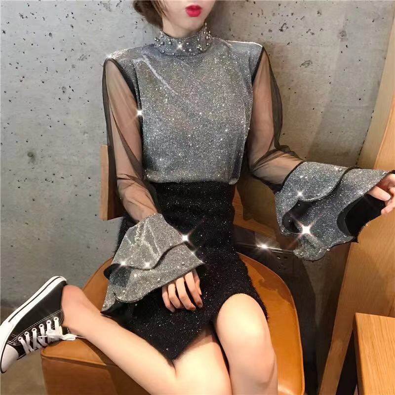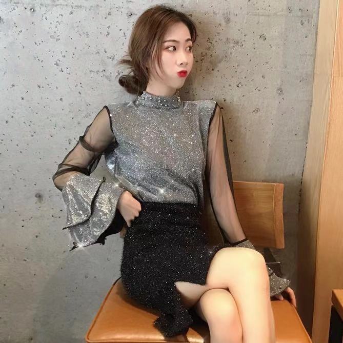 / 2018秋冬新款韓版上衣立領釘珠透視網紗拼接荷葉邊喇叭袖打底衫女
