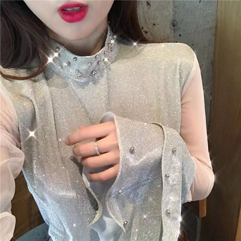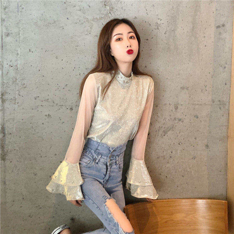 2018秋冬新款韓版上衣立領釘珠透視網紗拼接荷葉邊喇叭袖打底衫女
