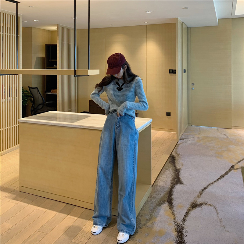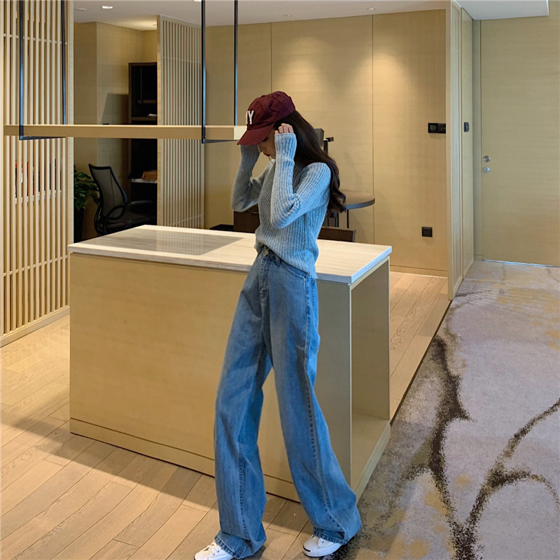 / 港味復古chic風褲子慵懶風寬松顯瘦直筒褲高腰顯瘦微喇叭牛仔長褲