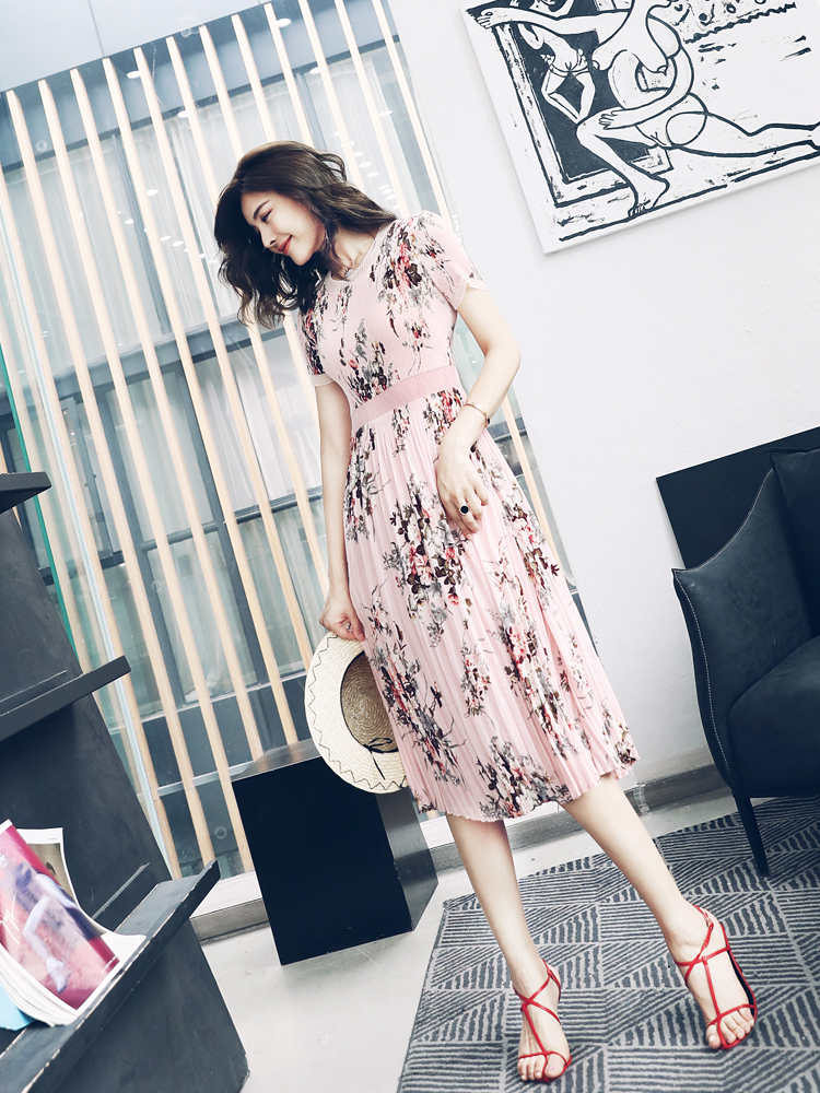 S秀2018夏季新款時尚彈性印花拼接蕾絲連衣裙甜美氣質高腰大擺裙