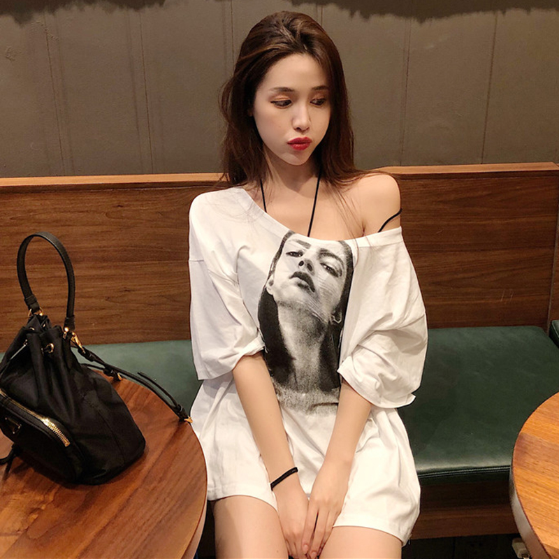 T恤女夏新款韓版女裝寬松中長款短袖體恤百搭人物印花休閑圓領TEE