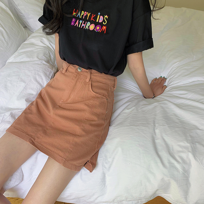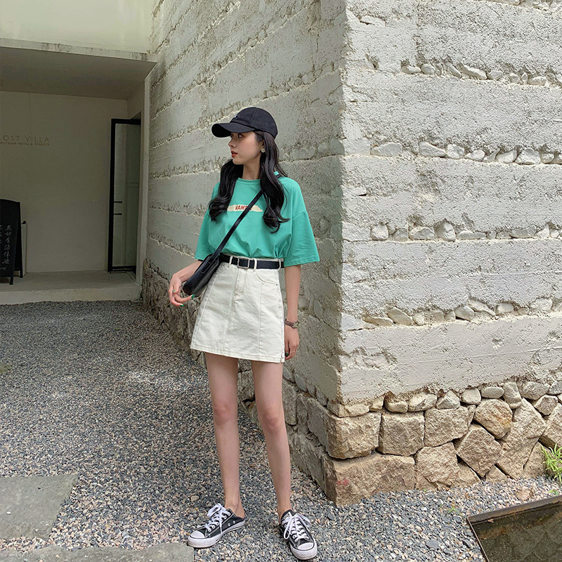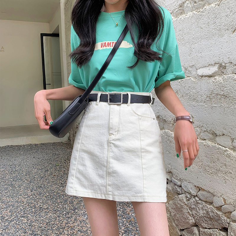 牛仔短裙上面搭配一個長袖的小襯衫 或者小T