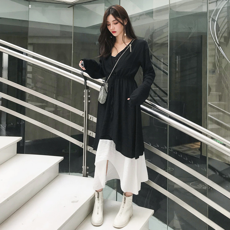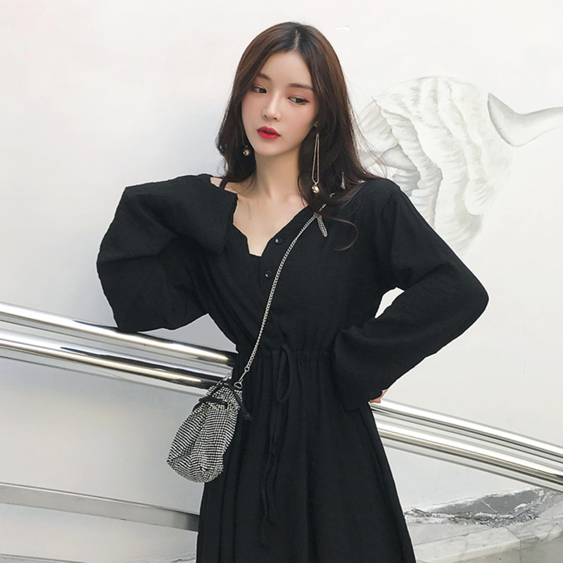 / 女神兩件套女秋裝新款氣質收腰V領長袖襯衫內搭不規則吊帶連衣裙