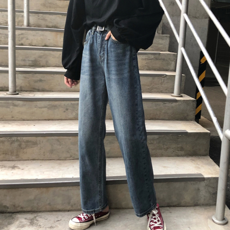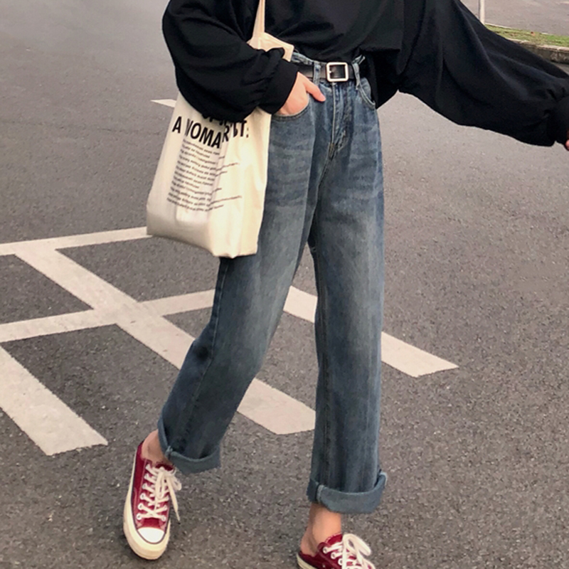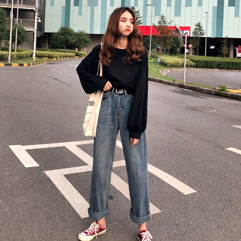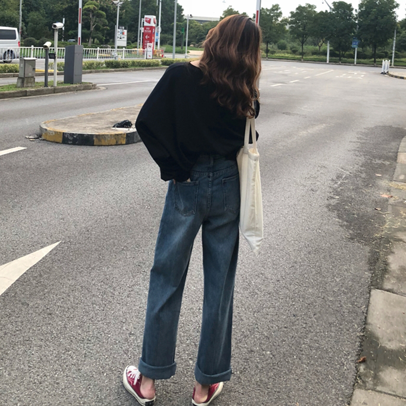 秋裝女2018新款韓版高腰做舊牛仔褲寬松闊腿褲時尚直筒九分褲子潮
