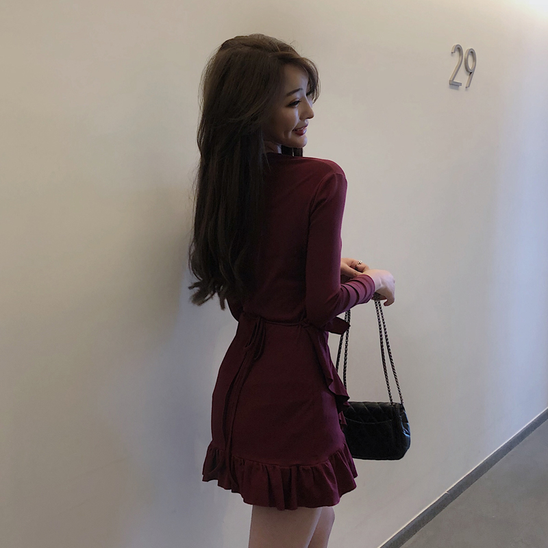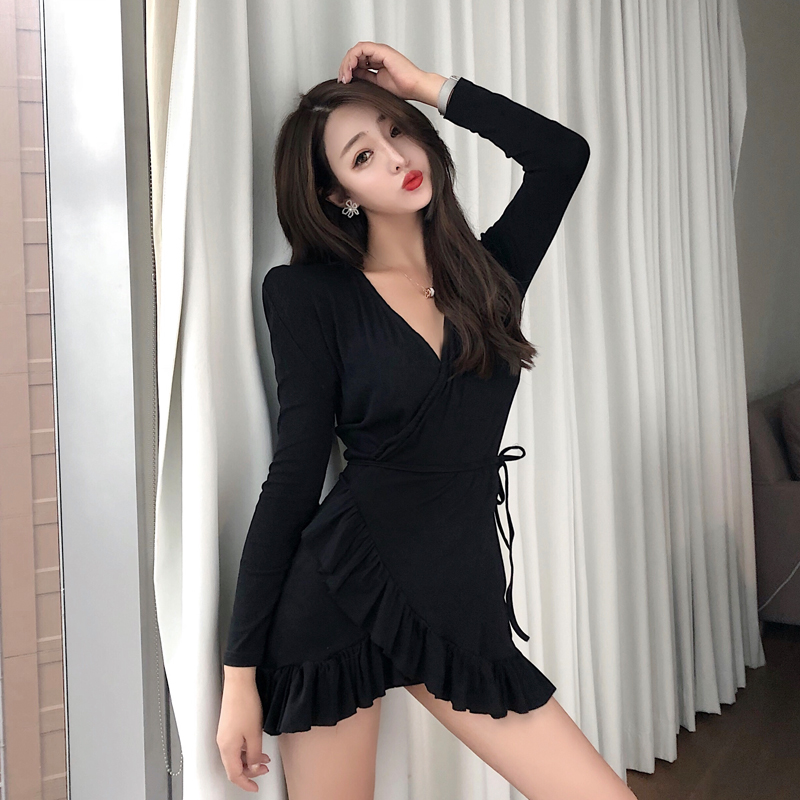 / 小心機新款性感修身柔美女人味荷葉邊V領一片式側系帶連衣短裙潮