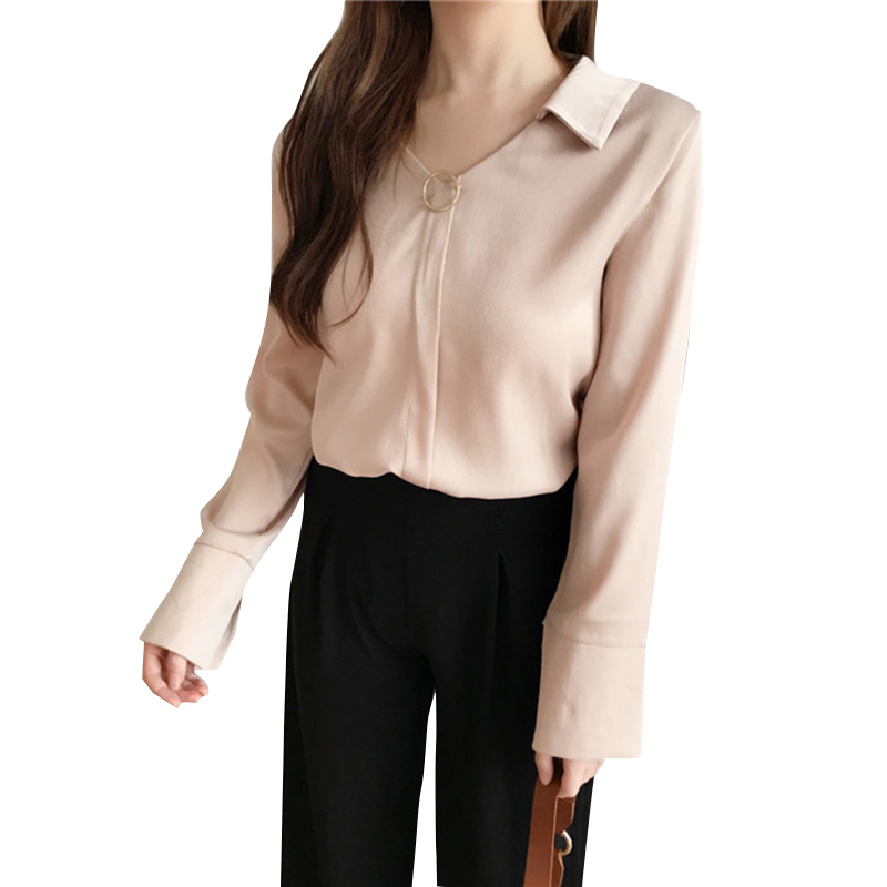 / 初秋新款韓版女裝港味復古氣質V領長袖雪紡襯衫少女純色百搭上衣
