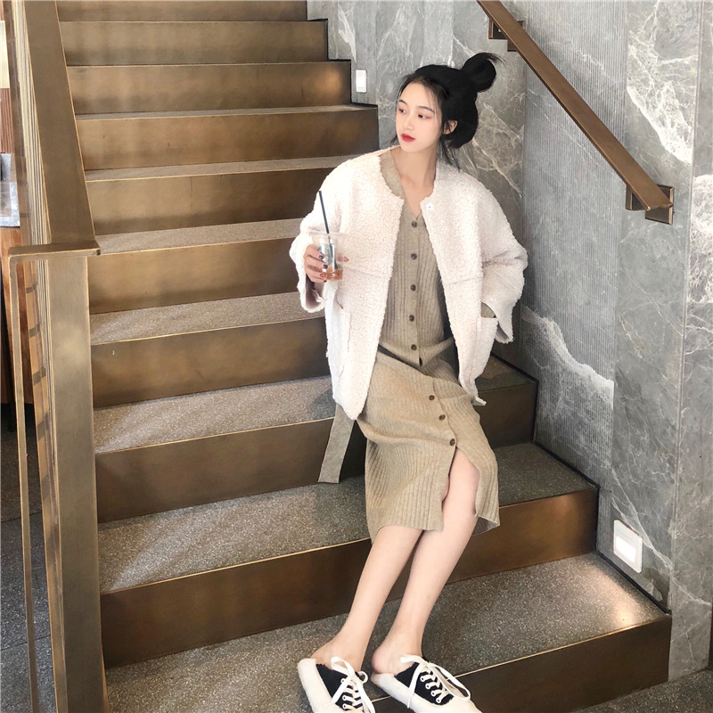 / 韓國復古風修身坑條長袖針織連衣裙兩件套寬松加厚外套時尚套裝女