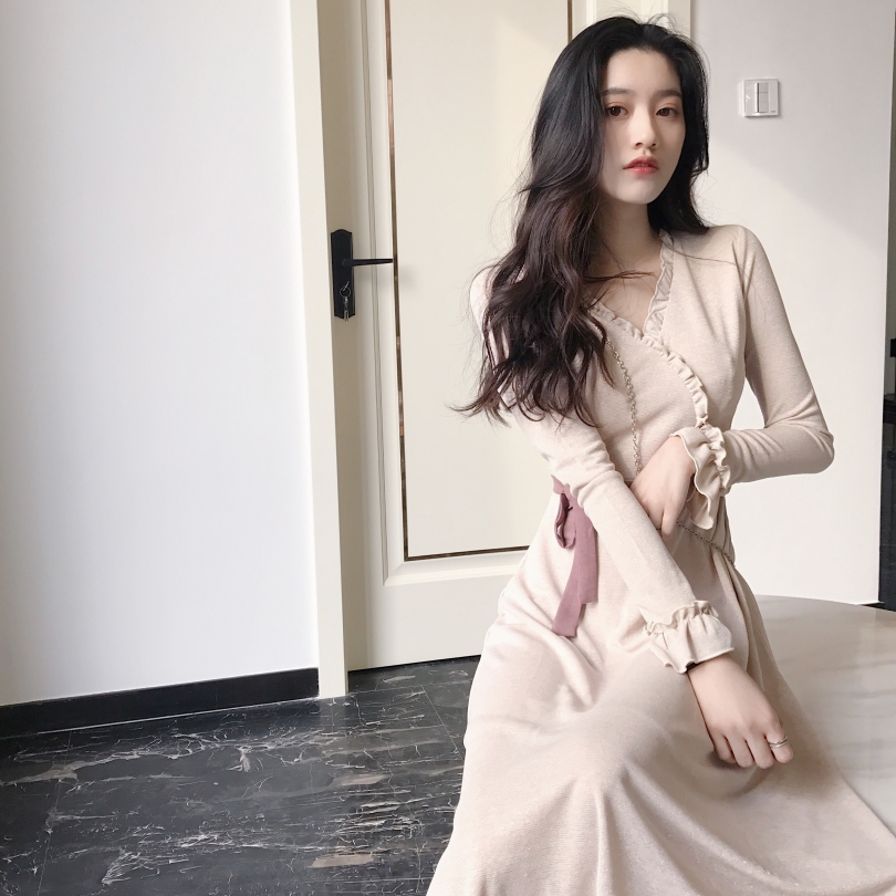 / 晚晚風新款韓版百搭中長款森女系時尚小清新chic花邊系帶連衣裙潮