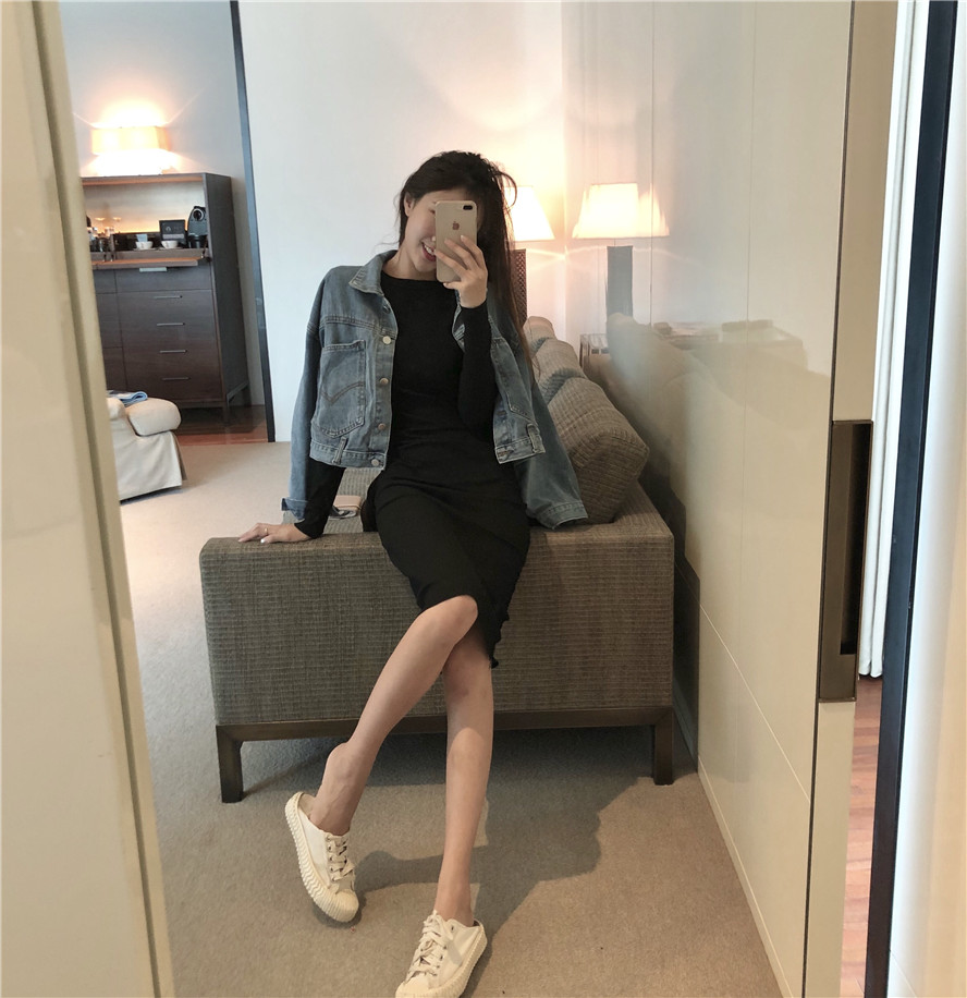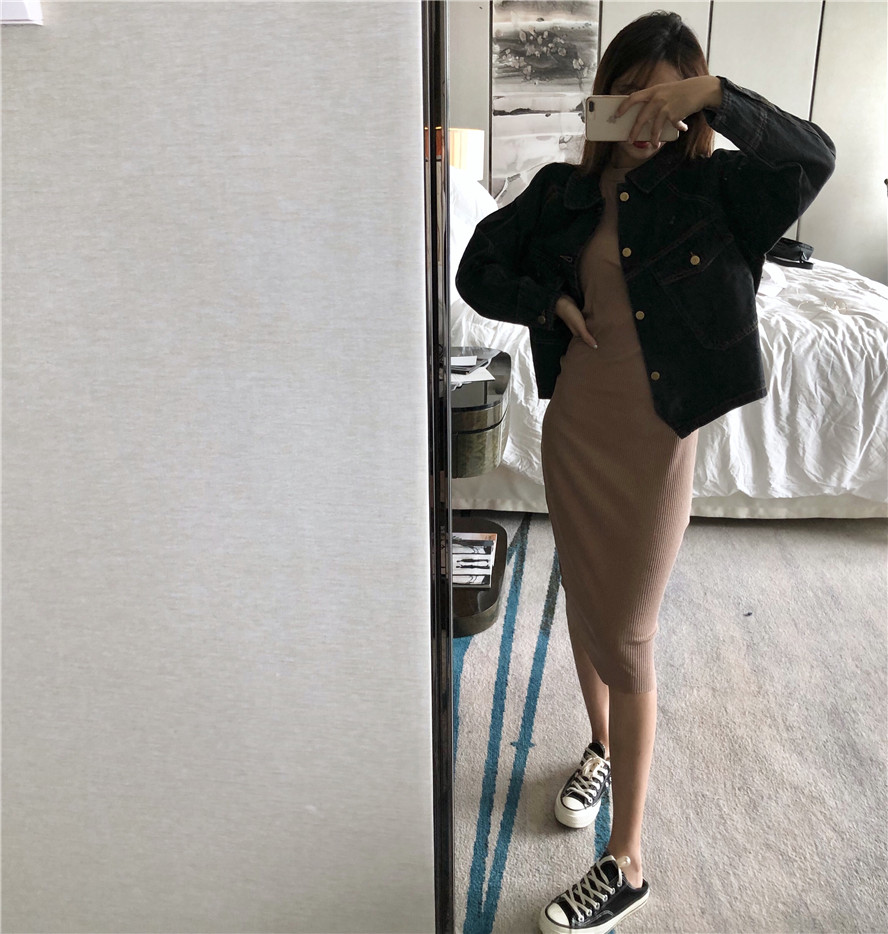 2018秋裝新款韓版女港風牛仔短外套修身圓領包臀連衣裙時尚套裝潮