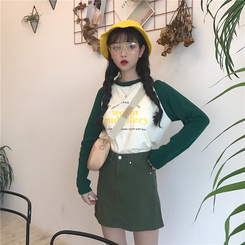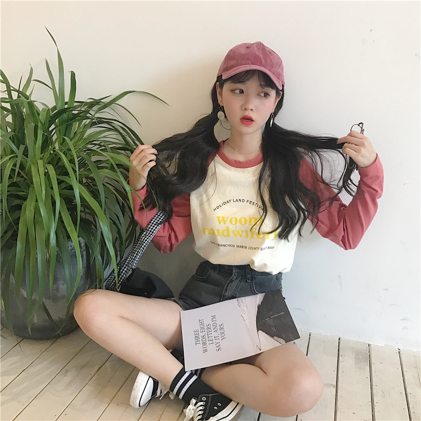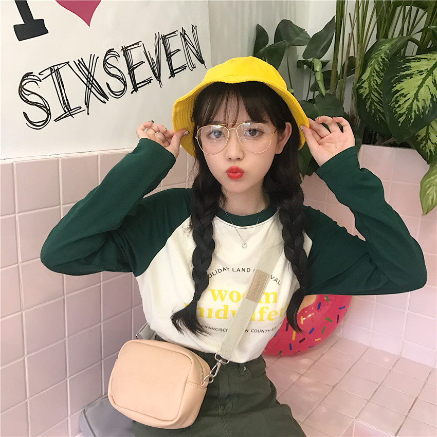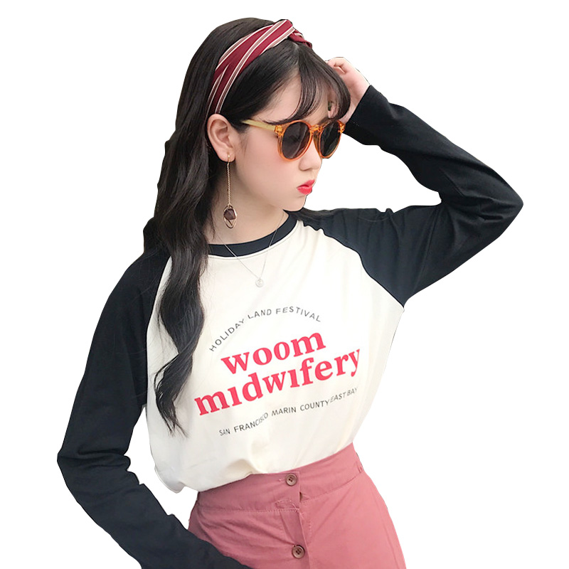 / 秋裝女裝新款韓版百搭插肩袖字母寬松長袖套頭T恤上衣打底衫學生