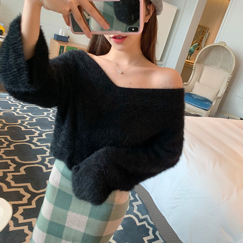 / 慵懶小性感一字領露肩V領針織毛衣+毛呢格子修身半身裙時尚兩件套