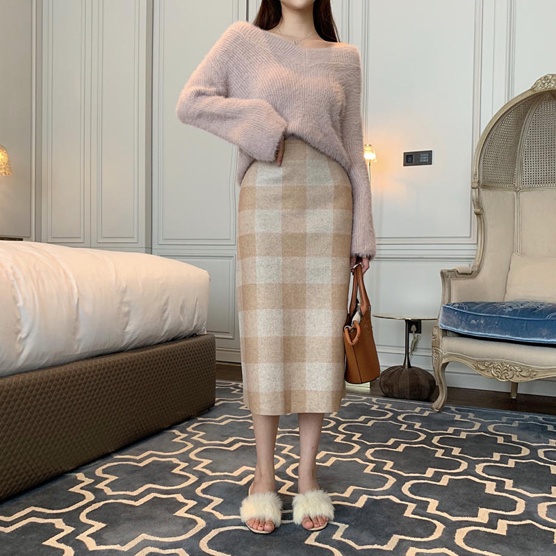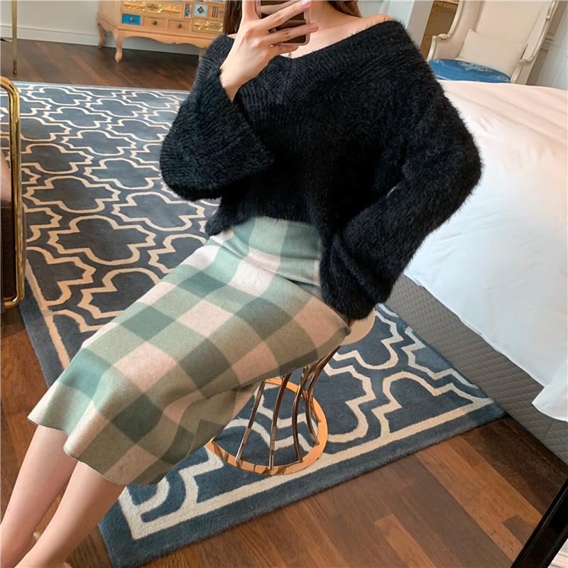慵懶小性感一字領露肩V領針織毛衣+毛呢格子修身半身裙時尚兩件套
