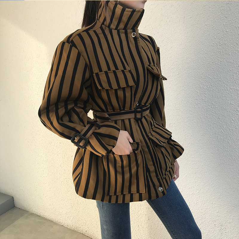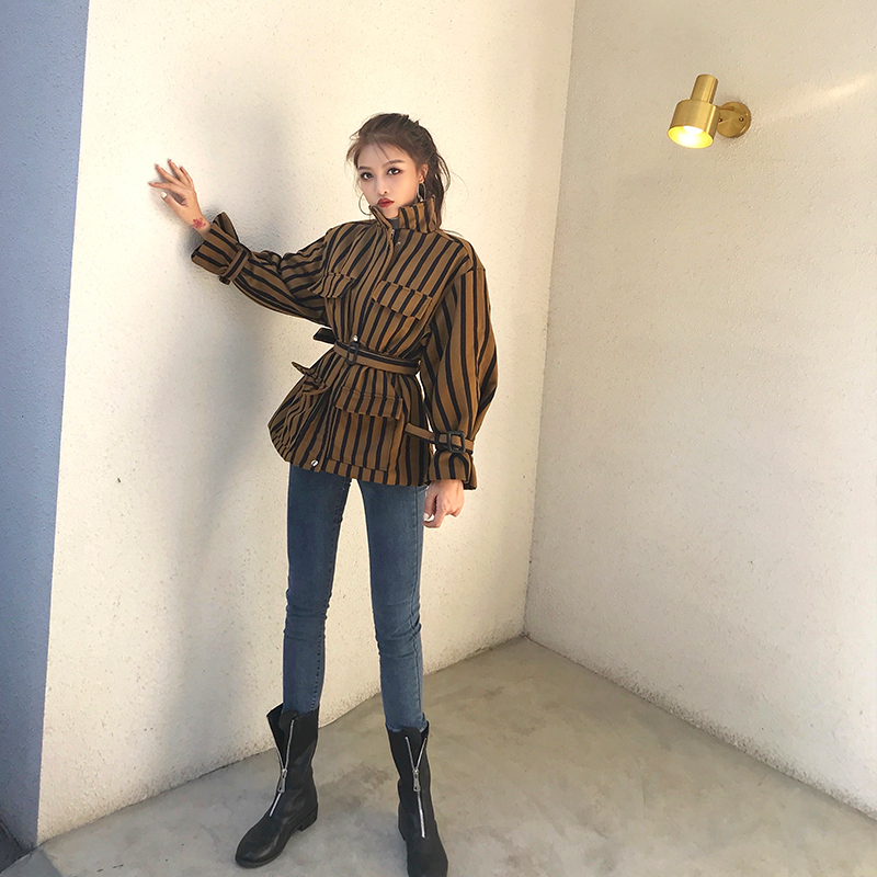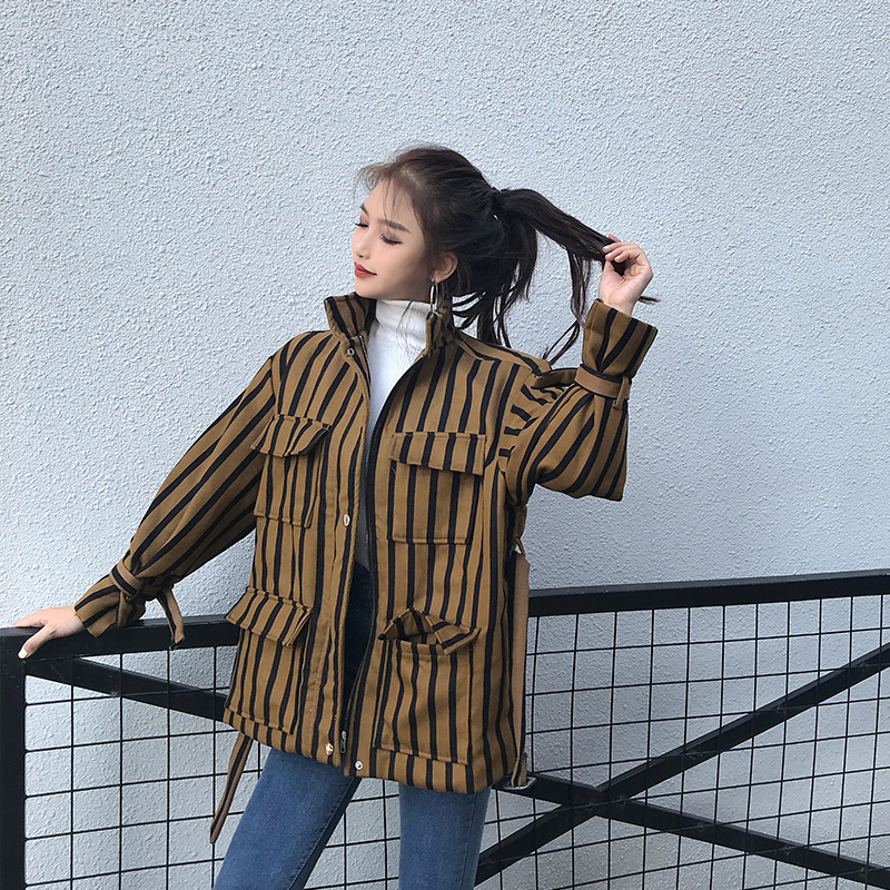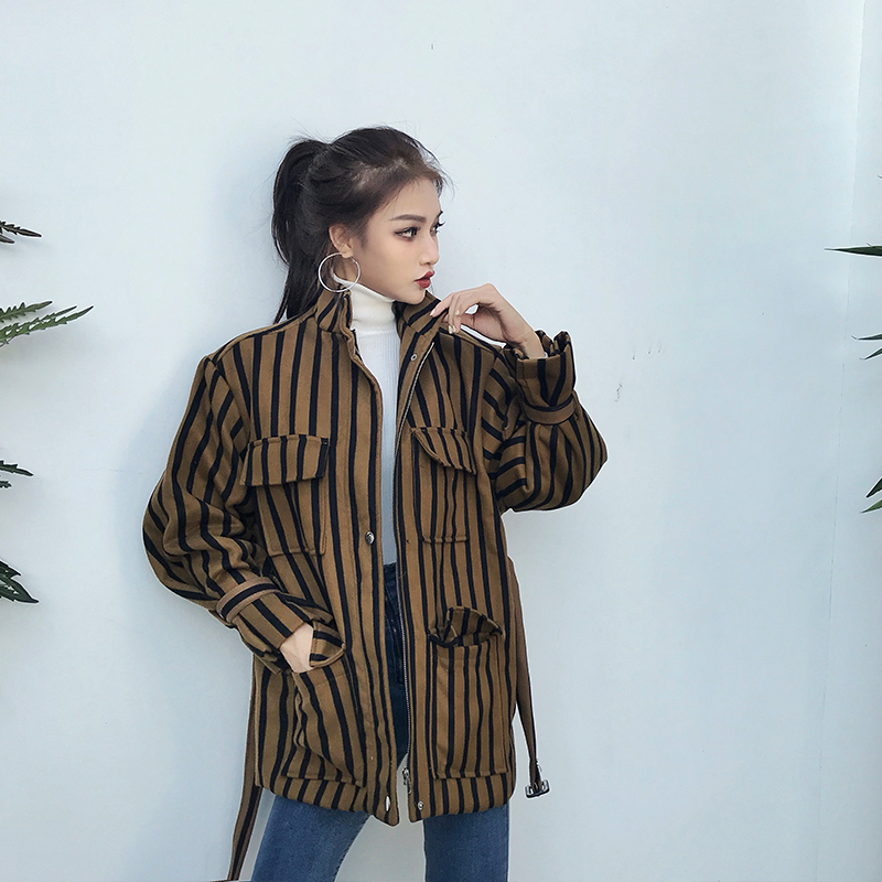 / 港味復古chic新款韓版寬松長袖條紋拉鏈中長款開衫百搭氣質外套女