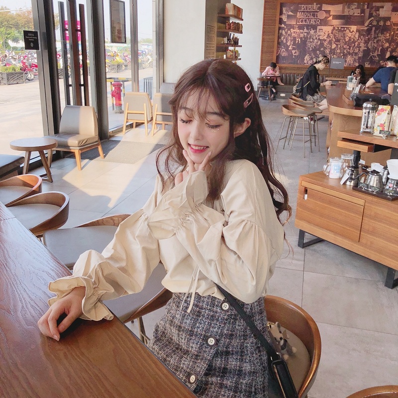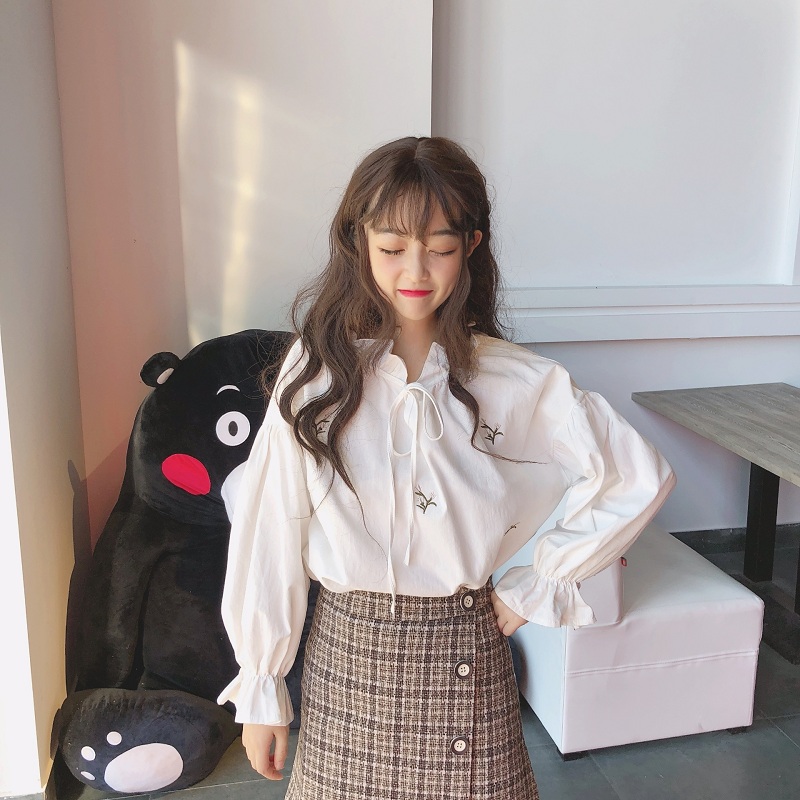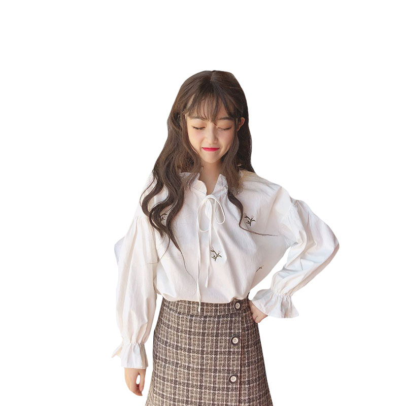 / 秋季女裝韓版chic小清新刺繡荷葉邊系帶襯衫寬松休閑長袖襯衣上衣