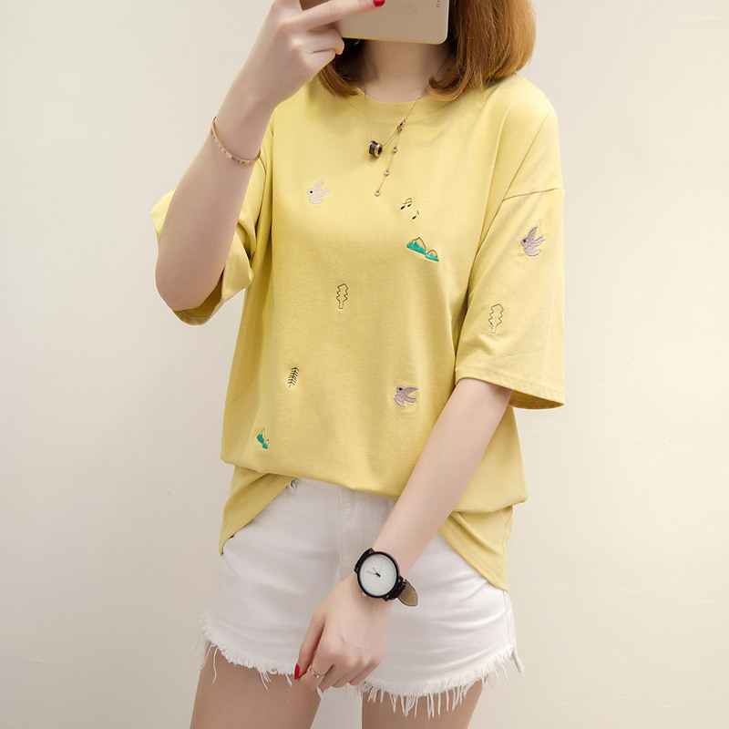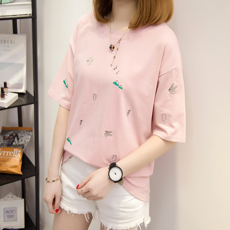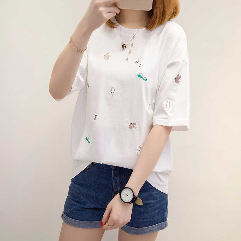 短袖t恤女寬松上衣女夏韓版白色體恤衫刺繡衣服夏裝新款女裝