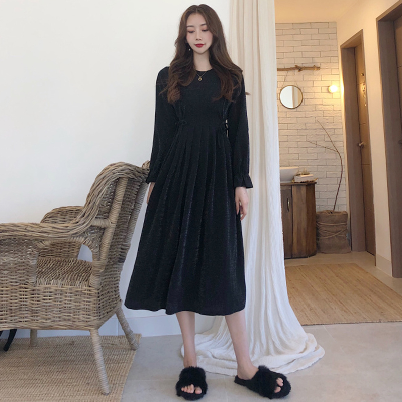 / 高領范成熟女裝連衣裙秋裝2018新款氣質閃閃亮絲收腰a字大擺裙子