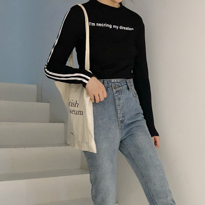 / 字母印花長袖t恤打底衫女修身顯瘦圓領上衣秋裝新款學生條紋體恤