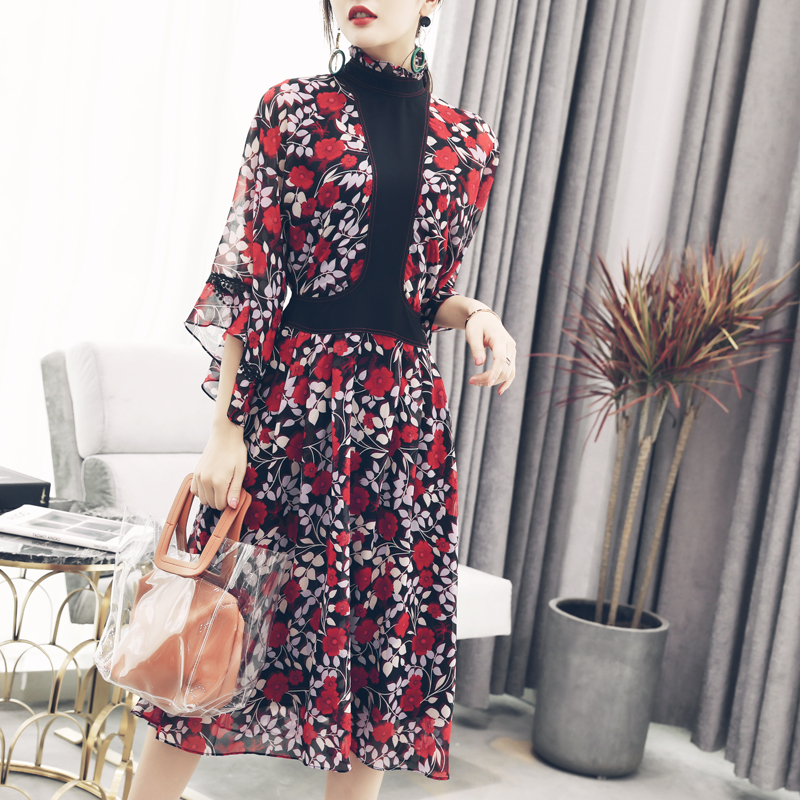 S秀2018夏裝新款復古時尚蝙蝠袖印花裙中高腰顯瘦雪紡連衣裙子