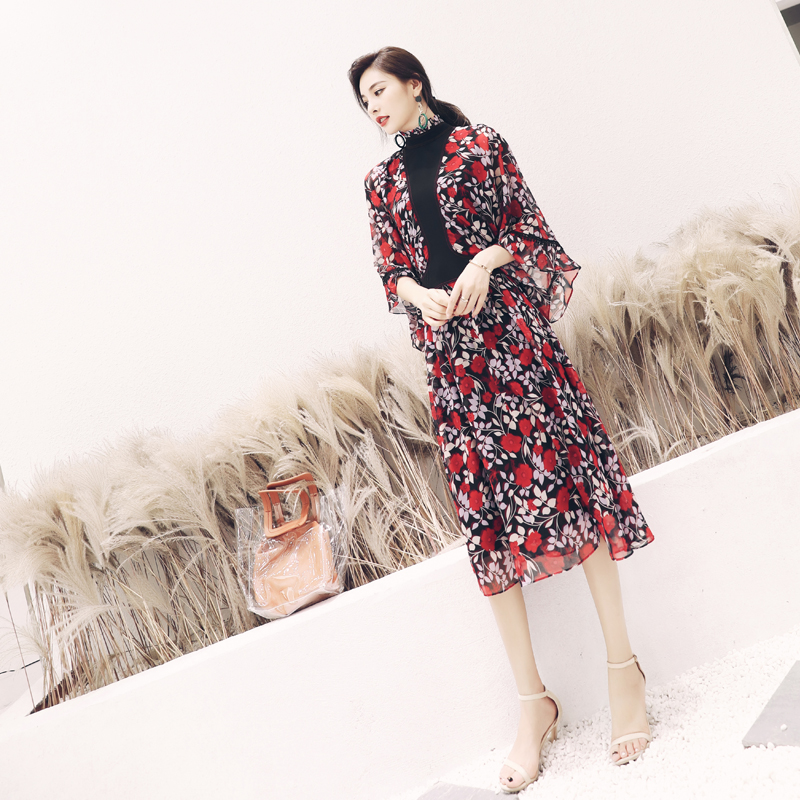 / S秀2018夏裝新款復古時尚蝙蝠袖印花裙中高腰顯瘦雪紡連衣裙子