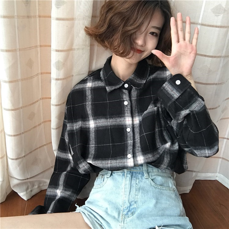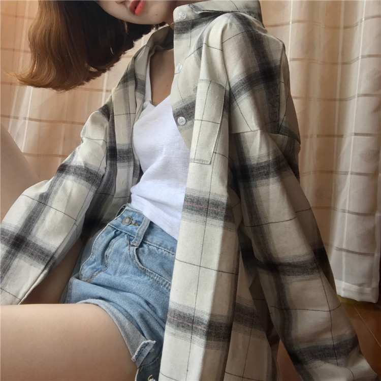 / 秋季女裝韓版寬松百搭顯瘦大格子長袖襯衫中長款休閑襯衣上衣外套