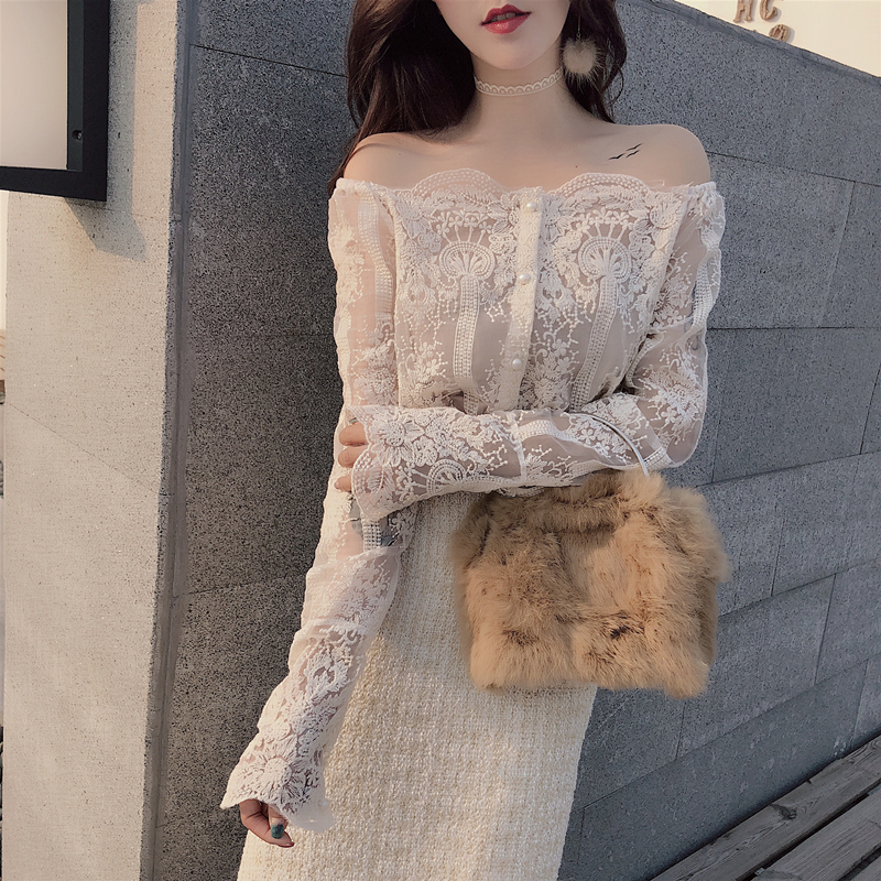 / 時尚套裝女夏2018新款鉤花蕾絲透視露肩單排扣襯衫+小吊帶兩件套