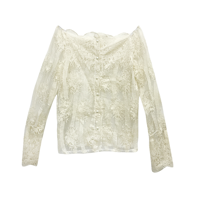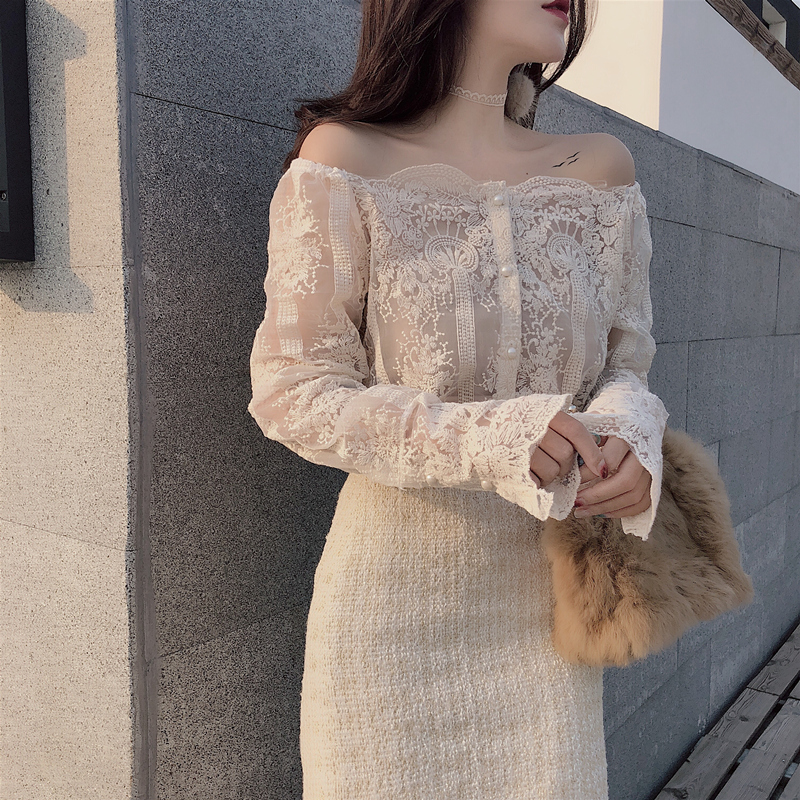 復古韓國chic風性感透視蕾絲鏤空高領顯瘦透視網紗喇叭袖內搭上衣