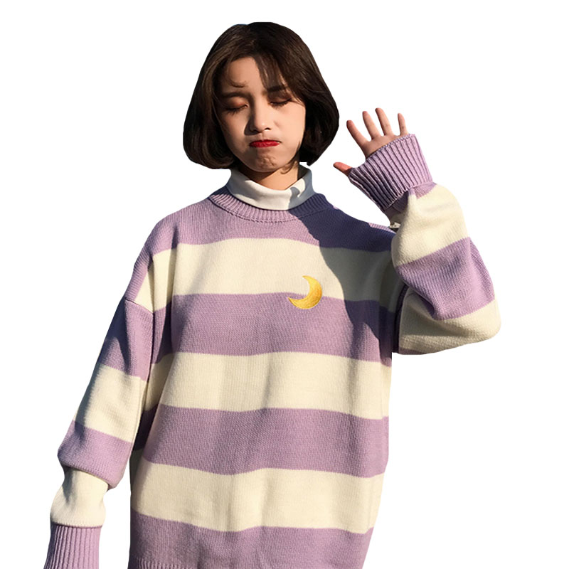 / 秋季女裝韓版學院風寬松條紋月亮刺繡套頭長袖針織衫毛衣上衣外套