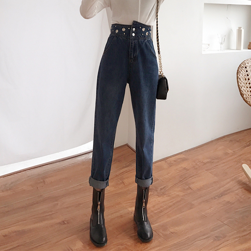 牛仔褲女冬裝2018新款韓版高腰顯瘦老爹褲學生寬松釘珠哈倫長褲子