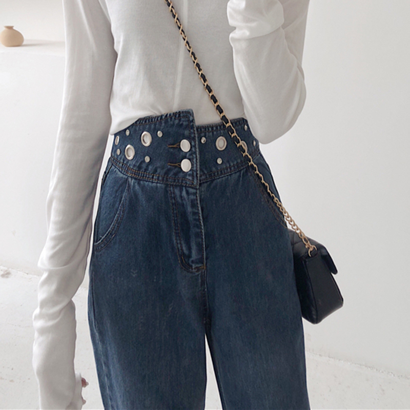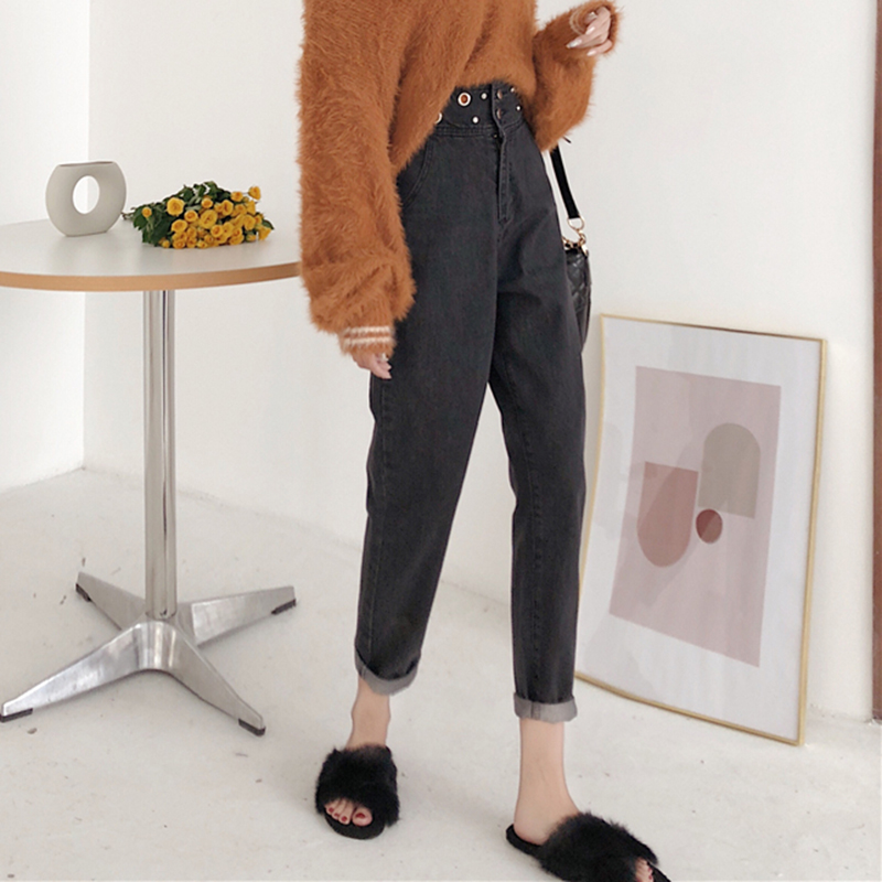 / 牛仔褲女冬裝2018新款韓版高腰顯瘦老爹褲學生寬松釘珠哈倫長褲子