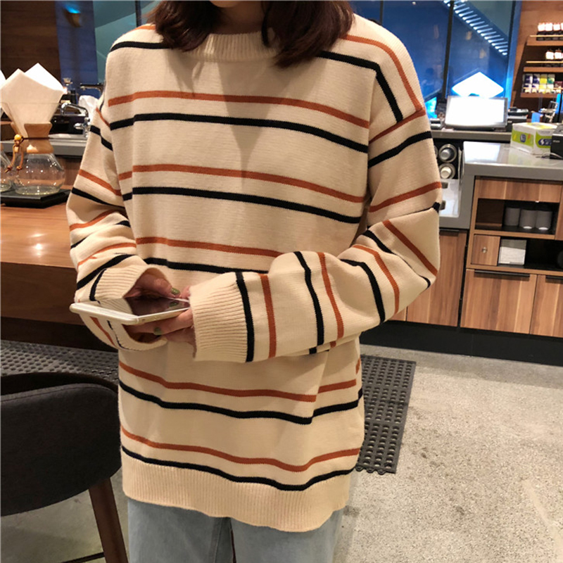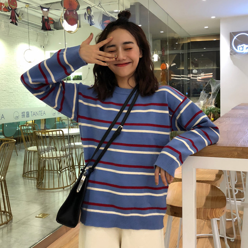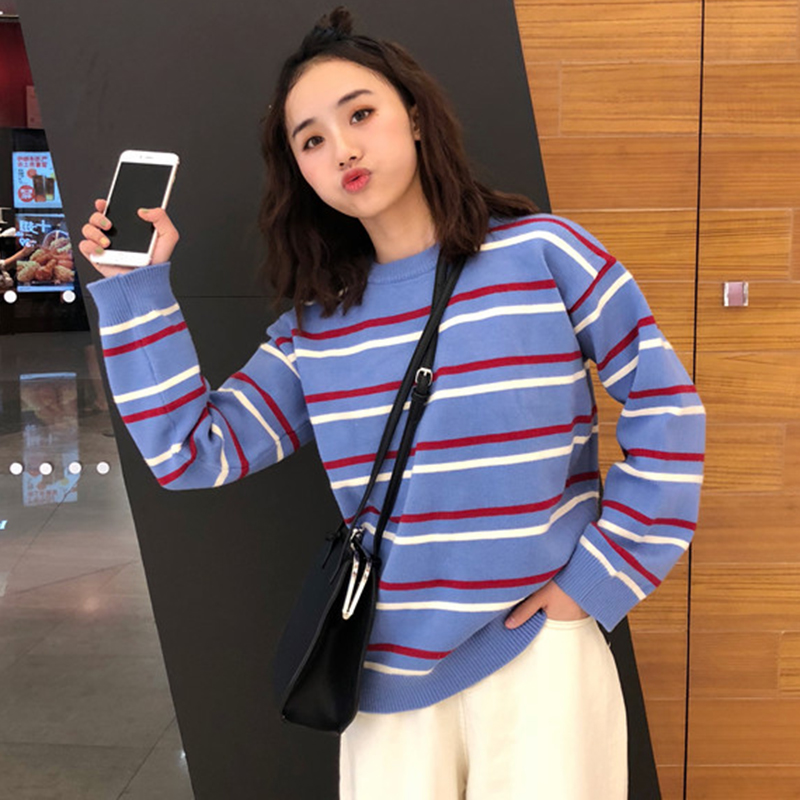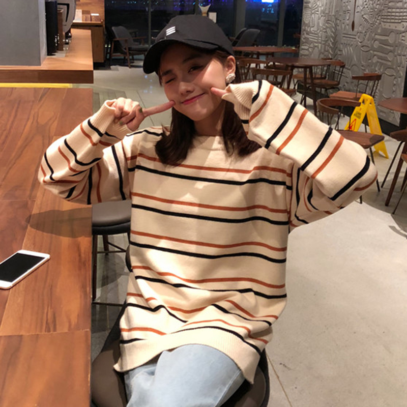 chic慵懶風套頭針織衫女秋冬裝2018新款韓版百搭條紋寬松毛衣外套