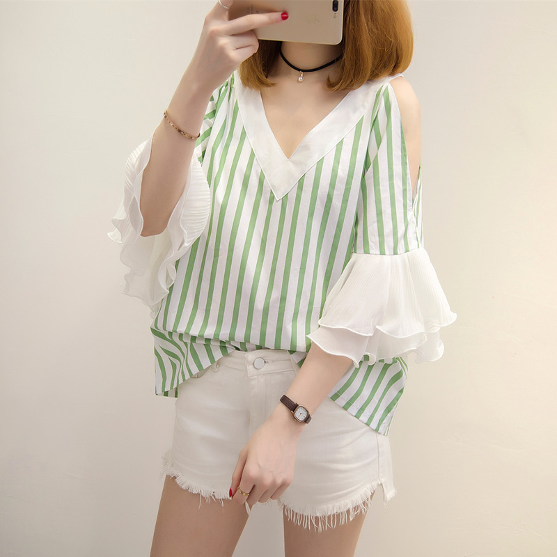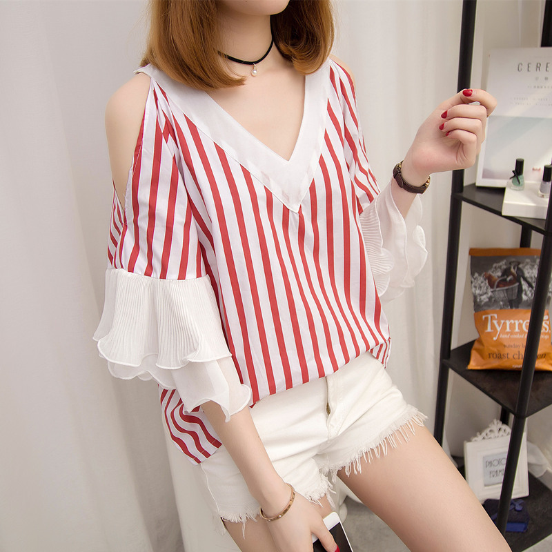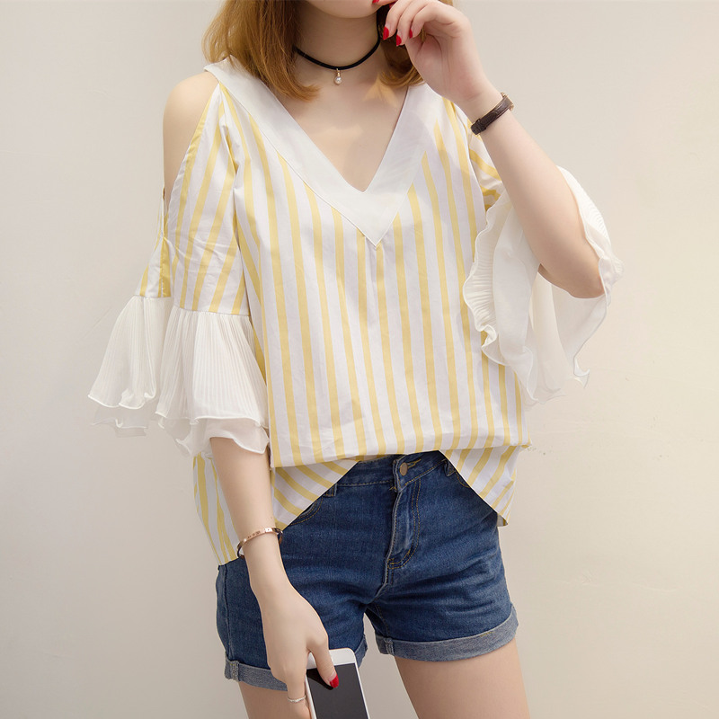 / 夏裝新款女荷葉袖露肩白t恤女半袖寬松條紋bf風小清新上衣女