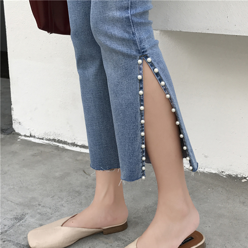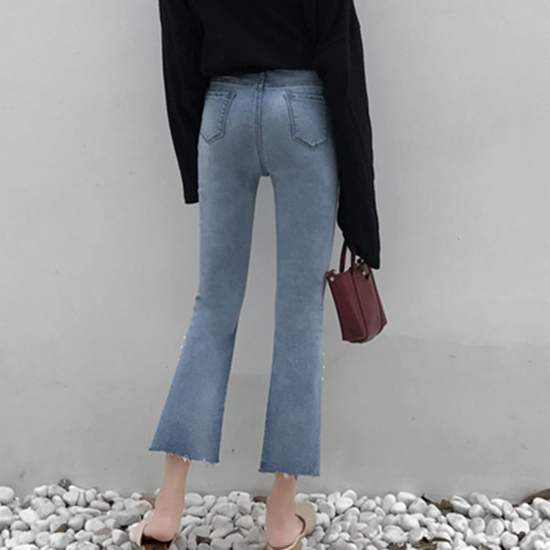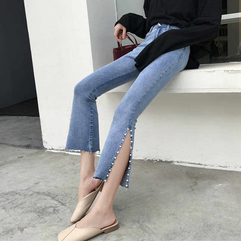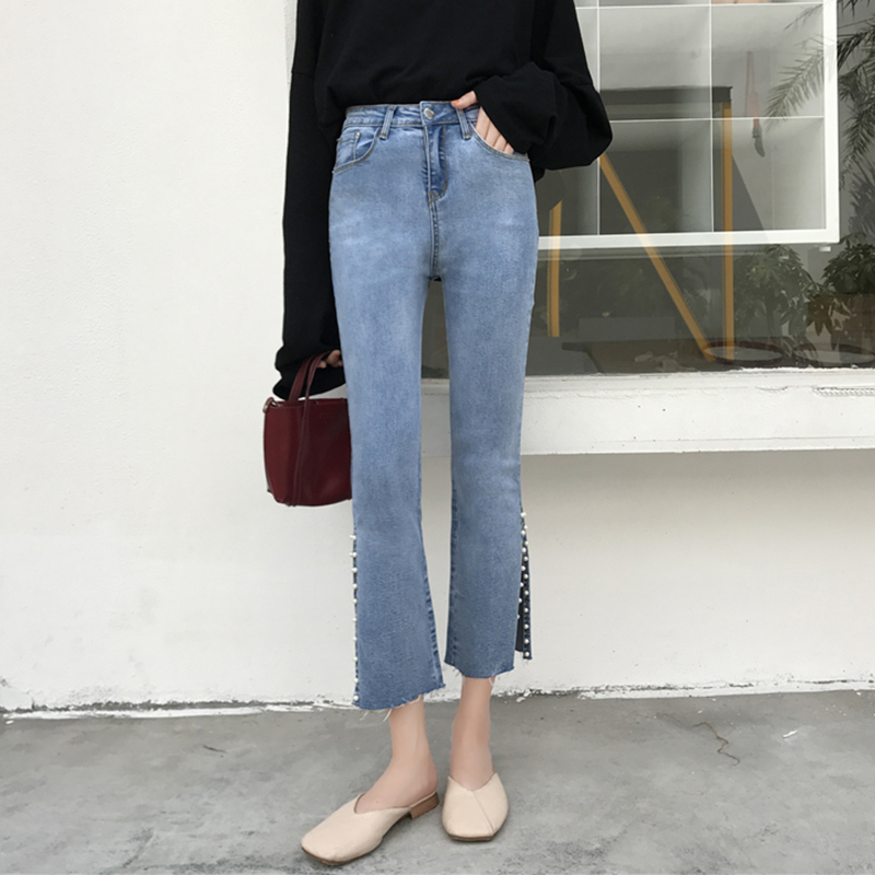 秋新款韓版女裝修身高腰彈力九分褲開叉釘珠喇叭褲百搭修身牛仔褲