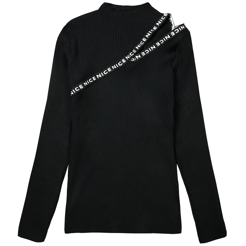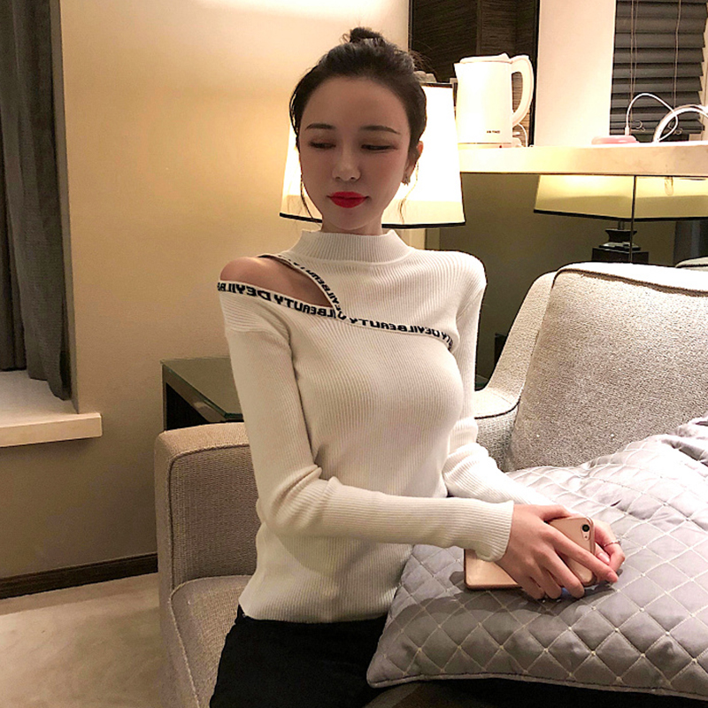 / 個性露肩字母上衣女秋裝新款港味修身打底衫氣質小高領長袖針織衫