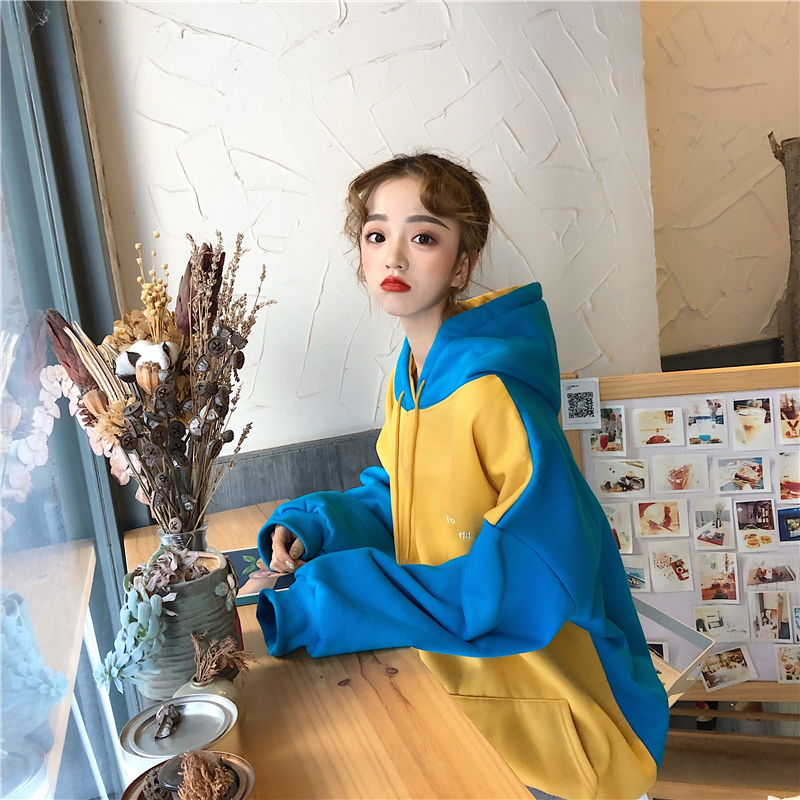 / 秋冬女裝韓版中長款慵懶風拼色寬松刺繡字母連帽套頭衛衣上衣外套